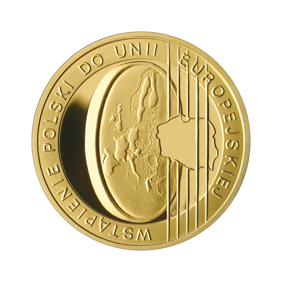 Numizmat został wykonany ze złota i charakteryzuje się eleganckim, nowoczesnym designem, który symbolicznie przedstawia integrację Polski z europejską wspólnotą. Rewers monety przedstawia symboliczną scenę włączenia Polski do struktur unijnych. Z lewej strony widnieje elipsa, na której zaznaczona została mapa kontynentu europejskiego. Po jej prawej stronie umieszczono kontur Polski, rozdzielony pionowymi liniami, które mogą symbolizować otwierające się granice lub przejście do nowej rzeczywistości polityczno-gospodarczej. W otoku widnieje napis WSTĄPIENIE POLSKI DO UNII EUROPEJSKIEJ. Na awersie monety dominuje godło Rzeczypospolitej Polskiej, umieszczony na tle elipsy z gwiazdami, przypominającej flagę Unii Europejskiej. Dziewięć pięcioramiennych gwiazd rozmieszczono wokół elipsy, a ich liczba i układ korespondują z symbolem jedności Europy. Projekt monety łączy elementy geograficzne, symboliczne i heraldyczne, tworząc kompozycję, która wyraża moment przełomowy w najnowszej historii Polski – integrację z Unią Europejską.