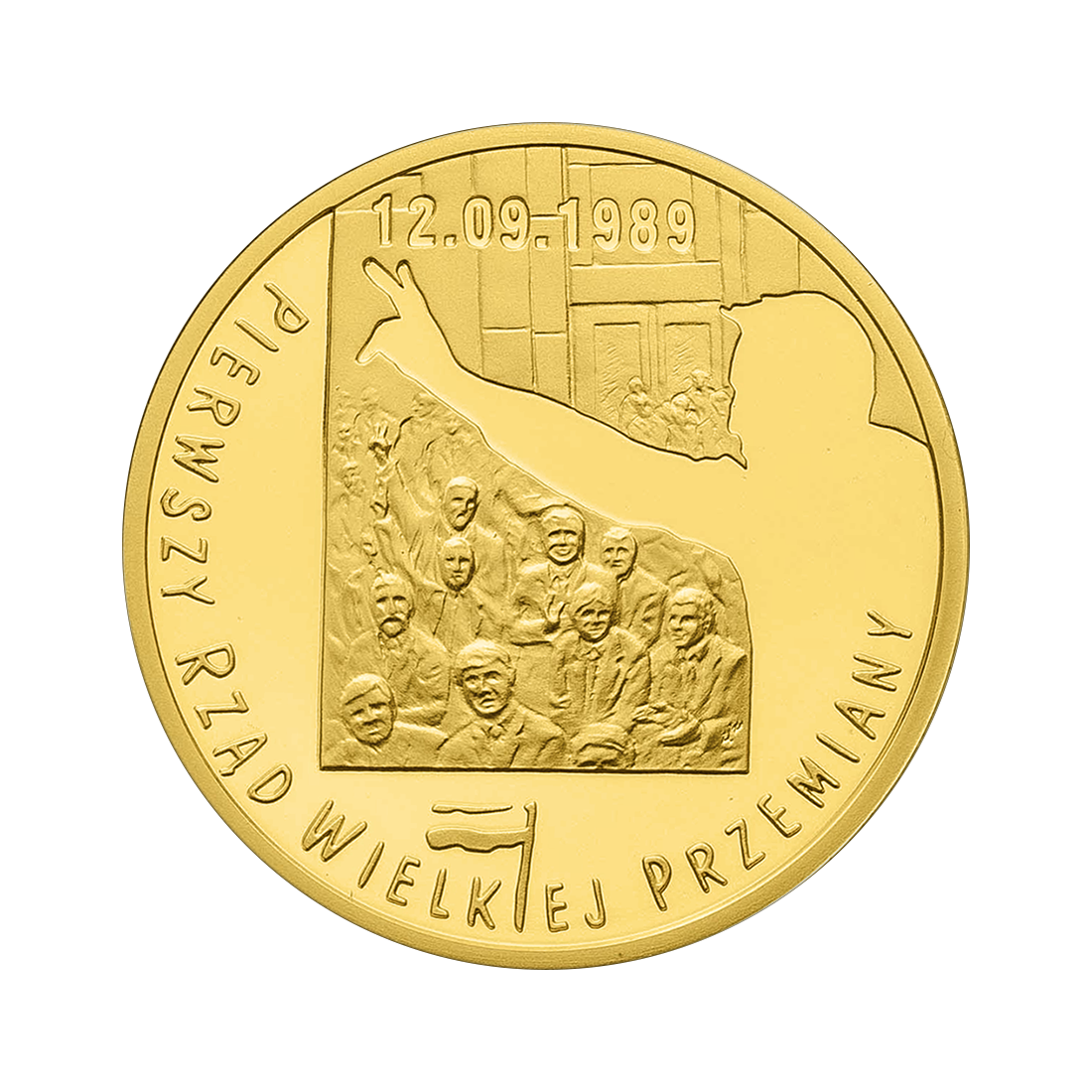 Numizmat upamiętnia przełomowe wydarzenie w historii Polski, wybory z 4 czerwca 1989 roku, które zapoczątkowały proces demokratycznych przemian w kraju. Rewers monety przedstawia dynamiczną scenę historyczną – postać Lecha Wałęsy, przemawiającego do tłumu zgromadzonego pod gmachem parlamentu z uniesioną ręką w geście zwycięstwa (znak V), symbolizując triumf demokracji. Powyżej widnieje data 12.09.1989, czyli dzień powołania pierwszego rządu wyłonionego po częściowo wolnych wyborach. Wzdłuż krawędzi umieszczono napis PIERWSZY RZĄD WIELKIEJ PRZEMIANY, który jednoznacznie podkreśla historyczne znaczenie tego momentu dla rozwoju demokracji w Polsce. Awers monety ukazuje symboliczny podział przestrzeni – po lewej stronie znajdują się żurawie portowe, odwołujące się do przemysłu stoczniowego i znaczenia robotniczych środowisk w przemianach społecznych. Po prawej stronie widnieje wieża wyciągowa kopalni, co stanowi odniesienie do roli górników oraz związków zawodowych w walce o wolność. Centralnie umieszczone zostało godło Rzeczypospolitej Polskiej, oznaczenie nominału, a także data emisji.