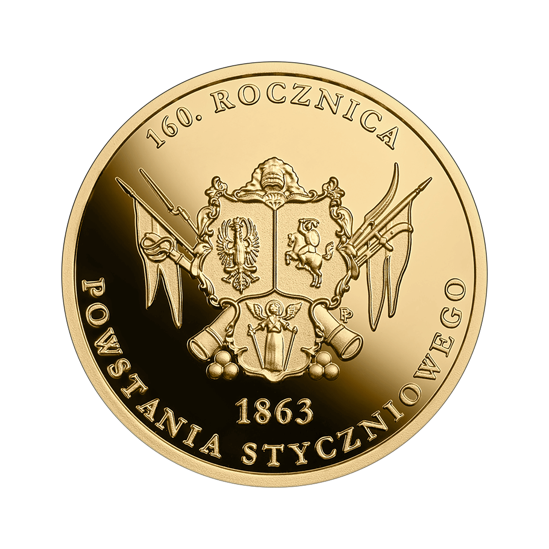 Złota moneta, charakteryzująca się starannie dopracowanym projektem. Upamiętnia 160. rocznicę wybuchu Powstania Styczniowego — jednego z najważniejszych zrywów niepodległościowych w historii Polski. Powstanie, które rozpoczęło się 22 stycznia 1863 roku, było odpowiedzią narodu polskiego na brutalną politykę zaborczą Imperium Rosyjskiego i dążeniem do odzyskania suwerenności. Choć zakończyło się klęską militarną, zapisało się trwale w polskiej pamięci jako symbol odwagi, poświęcenia oraz niezłomnej walki o wolność i godność narodową. Moneta wydana z tej okazji stanowi hołd dla bohaterów powstania oraz przypomnienie o znaczeniu niepodległości w dziejach Polski.