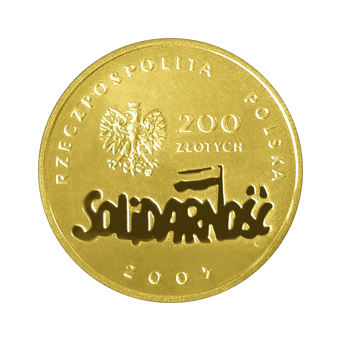 Wygląd złotej monety 200 zł 25-lecie NSZZ Solidarność 2005