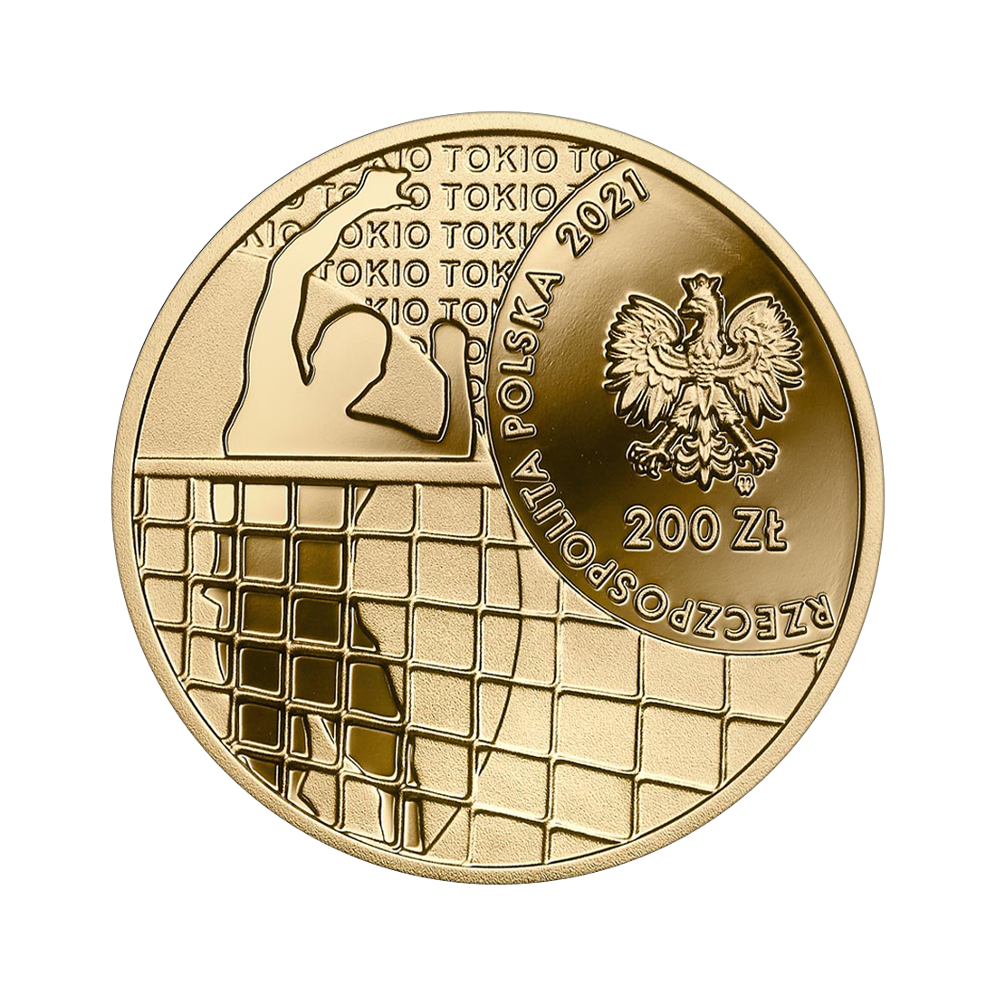 Moneta ma nowoczesny, dynamiczny wygląd, łączący sportowy charakter z elegancją złotej powierzchni. Kompozycja jest wyrazista i symboliczna, podkreślająca olimpijskiego ducha. Rewers przedstawia sylwetkę siatkarza w trakcie dynamicznego ataku, z ręką uniesioną do uderzenia piłki. Postać emanuje energią i ruchem. Po lewej stronie widnieje napis umieszczony w półkolu POLSKA REPREZENTACJA OLIMPIJSKA, który akcentuje narodowy wymiar emisji. Po prawej stronie widoczny jest napis TOKIO 2020, a pod nim znak Polskiego Komitetu Olimpijskiego, łączący biało-czerwoną flagę z olimpijskimi kołami. Na awersie widoczna jest dynamiczna sylwetka siatkarza w akcji, z napisem TOKIO w tle. Po prawej stronie znajduje się orzeł w koronie – godło Polski, a poniżej rok wydania i nominał. Moneta łączy nowoczesność z oficjalnym charakterem, oddając ducha igrzysk olimpijskich.