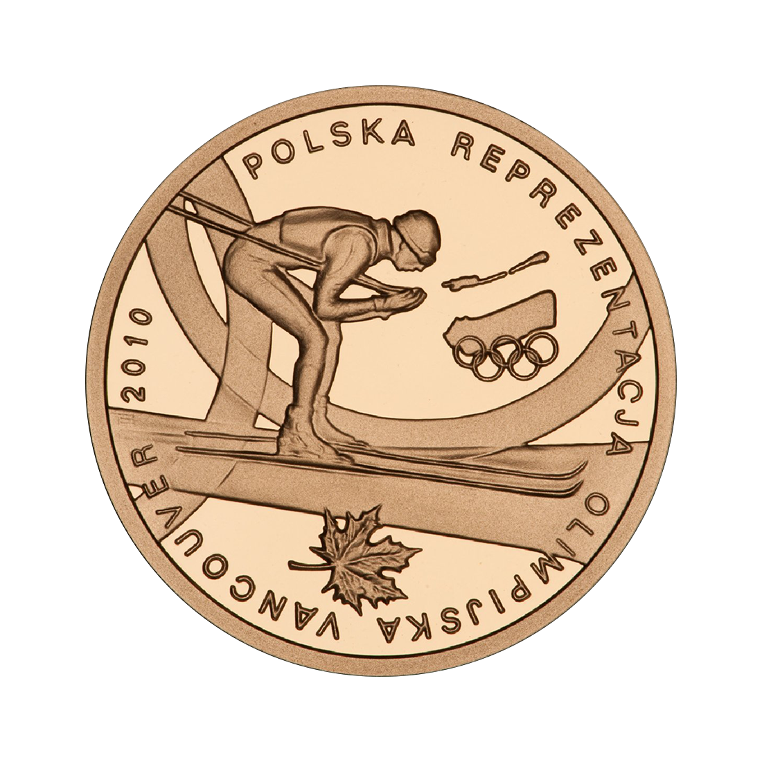 Złota moneta upamiętniająca udział polskiej reprezentacji olimpijskiej w Zimowych Igrzyskach Olimpijskich w Vancouver. Jej emisja stanowi wyraz uznania dla wyznaczających standardy sportowe Polaków, którzy rywalizowali na światowej arenie zimowej rywalizacji. Moneta jest częścią serii Polska Reprezentacja Olimpijska i została wydana w związku z obchodami Igrzysk w Vancouver, co czyni ją symbolicznym hołdem dla wszystkich naszych sportowców, których wysiłek i sukcesy wzmacniają poczucie narodowej dumy. Emisja monety wpisuje się w tradycję uhonorowania olimpijczyków przez Narodowy Bank Polski, uznając ich osiągnięcia jako element budujący wizerunek Polski na arenie międzynarodowej. Jest to nie tylko wartościowy obiekt kolekcjonerski, lecz także nośnik pamięci o determinacji, mistrzostwie sportowym i sile jednoczącej społeczeństwo poprzez sport.