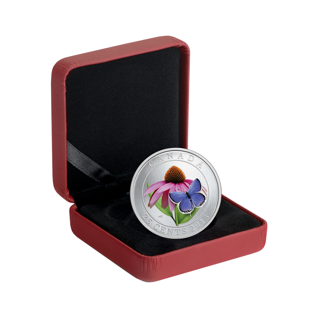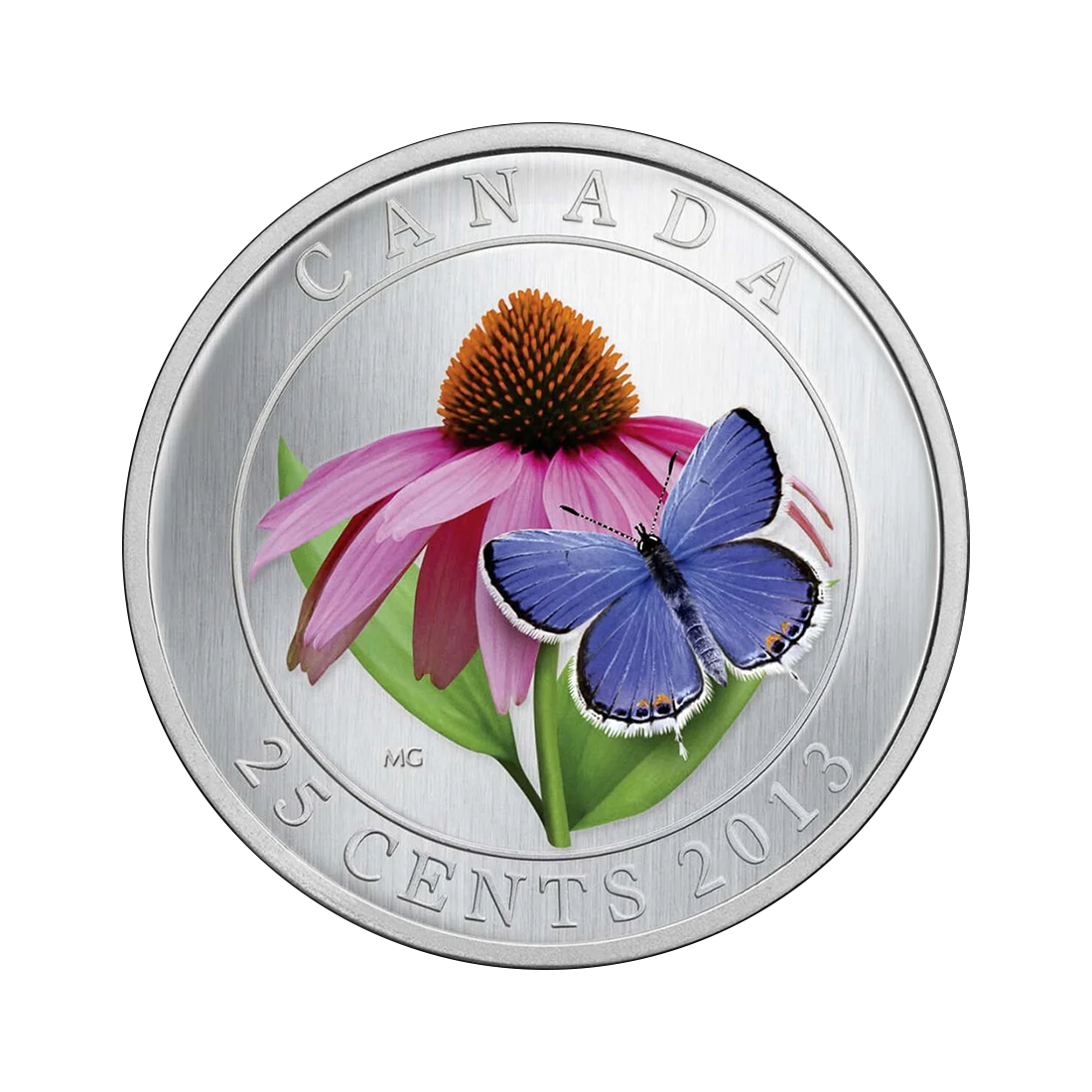 Kanadyjski artysta Maurice Gervais prezentuje na rewersie pięknie namalowany kwiat jeżówki purpurowej (Purple Coneflower). Ma on pomarańczowy środek i jasnofioletowe płatki osadzone na zielonej łodydze z dwoma gładkimi liśćmi. Na prawym dolnym płatku kwiatu siedzi motyl (Eastern Tailed Blue Butterfly), którego ciemnofioletowo-niebieskie skrzydła są zakończone białymi i czarnymi elementami. Ma on też charakterystyczne pomarańczowe kropki u podstawy tylnych skrzydeł. Na rewersie widnieje również napis CANADA, data 2013 i nominał 25 CENTS.