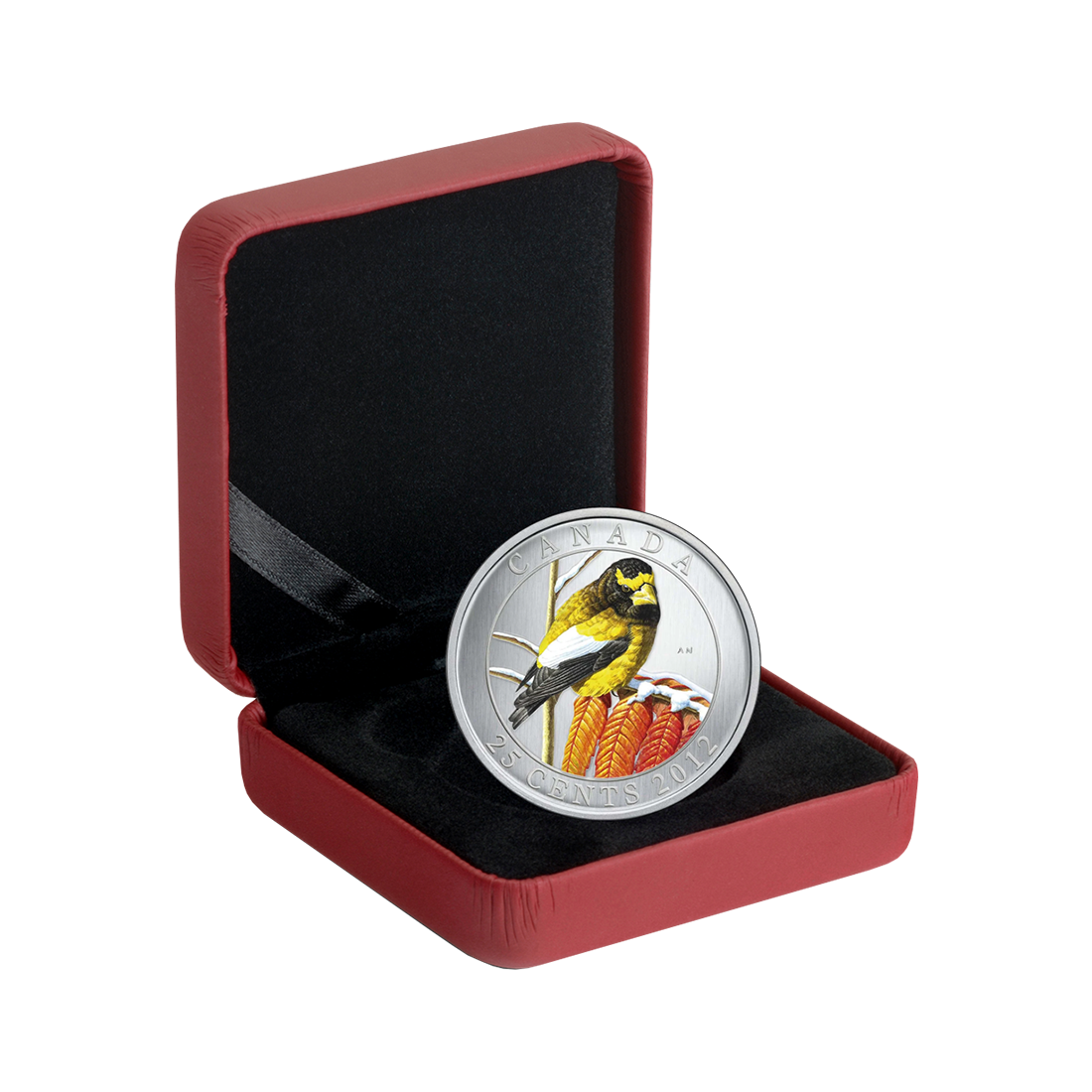 Zaprojektowana przez kanadyjskiego artystę Arnolda Nogy'ego, ta piękna malowana moneta na rewersie przedstawia złotopiórego samca gróbodzioba wieczornego, który przysiadł szczęśliwie na czerwono-listnej, ośnieżonej gałęzi. Widoczny jest tu też napis CANADA, nominał oraz rok bicia – 2012.