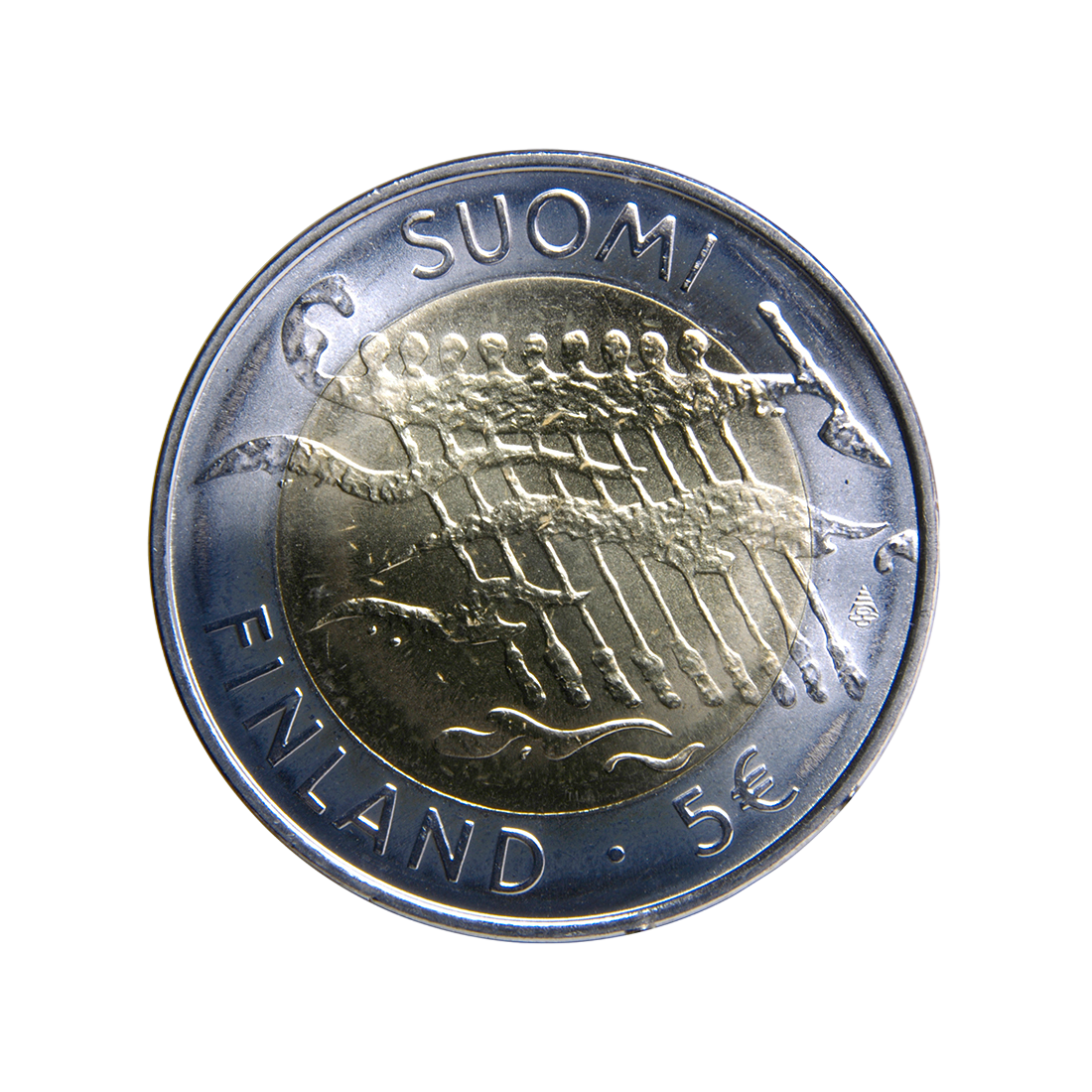 Awers: Na awersie przedstawiono dziewięć postaci wiosłujących w łodzi, symbolizujących dziewięć dekad niepodległości Finlandii. W tle widoczny jest napis: "SUOMI FINLAND · 5 €".