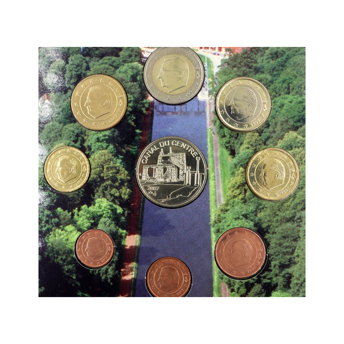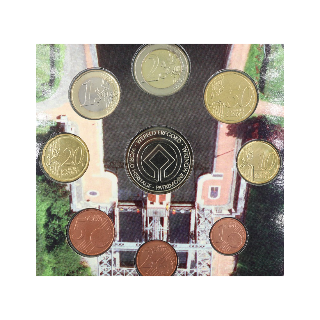 Całość zaprezentowana jest w przezroczystej plastikowej obliterówce, która umożliwia oglądanie monet bez konieczności wyjmowania ich z opakowania. Każda z monet ma swoje wyznaczone miejsce, ułożone według rosnących nominałów od najniższych centów do monet euro. Token umieszczony jest osobno, ale w tym samym blisterze, tak aby był dobrze widoczny i stanowił dopełnienie zestawu. Wszystkie elementy mają wyraźnie zachowany połysk menniczy. Na ośmiu monetach zastosowano jednolity motyw narodowy Belgii – na każdej z monet widnieje portret króla Alberta II wraz z jego monogramem. Ponadto na monetach obecny jest rok emisji, 12 gwiazd Unii Europejskiej oraz elementy typowe dla projektu Luc Luycx. Token przedstawia jeden z czterech wind śrubowych z Kanału du Centre, który jest historycznie i technicznie znaczący dla Belgii. Na jednej stronie medalu widnieje rok emisji, zaś na drugiej stronie umieszczono logo UNESCO wraz z napisem.