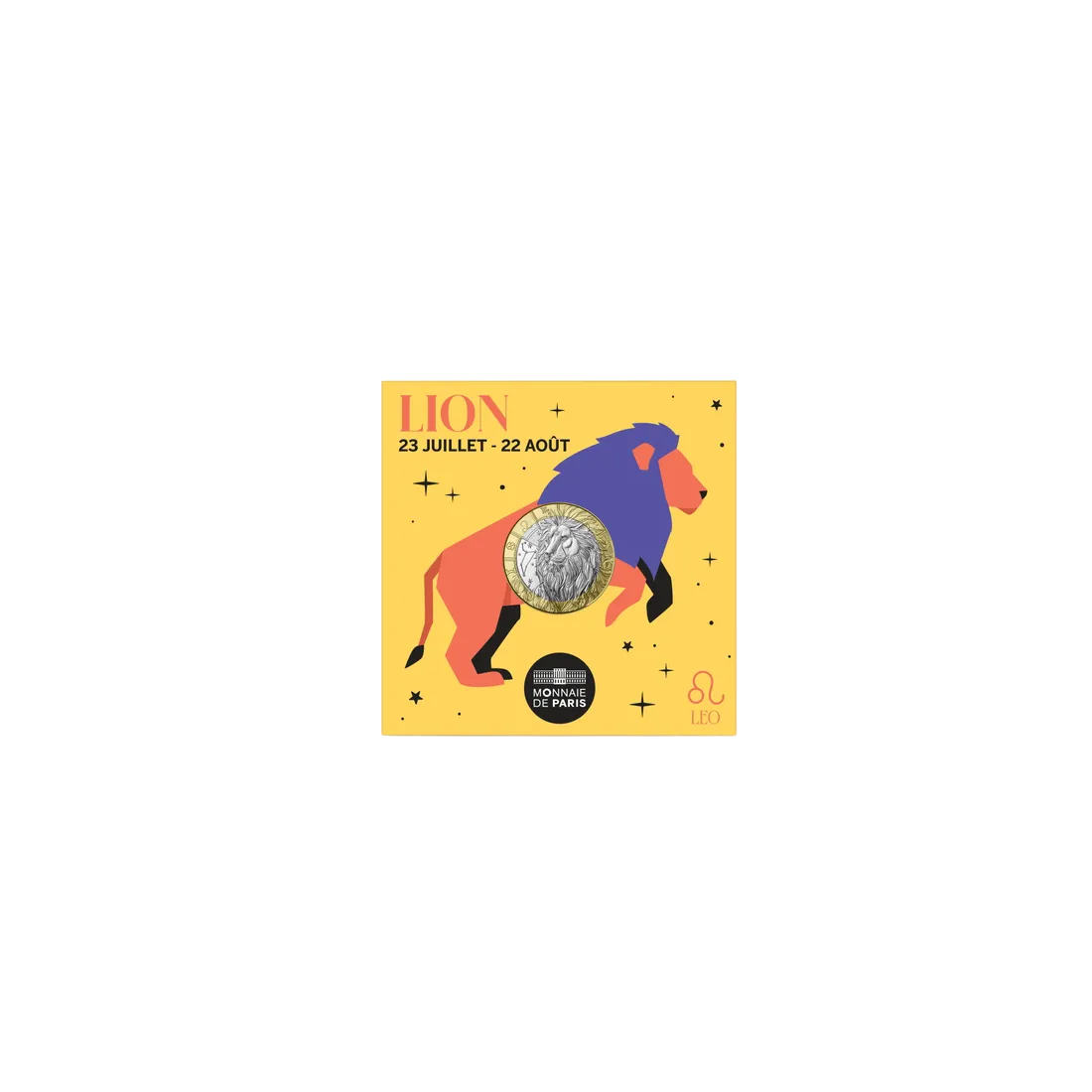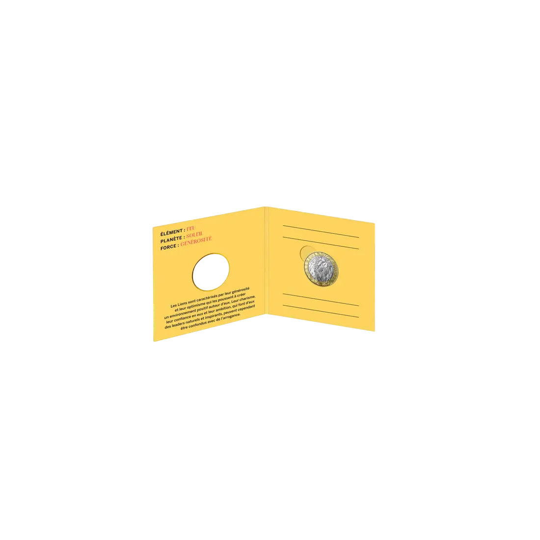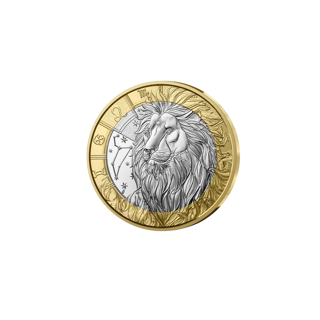 Rewers monety to prawdziwe dzieło sztuki grawerskiej. Centralne miejsce zajmuje popiersie Lwa z imponującą, mistrzowsko oddaną grzywą i słonecznym dyskiem umieszczonym na czole, symbolizującym planetę rządzącą. Tło zdobi rozgwieżdżone niebo z wyraźnie zaznaczoną konstelacją Lwa. Złocony wieniec monety przedstawia koło zodiaku, gdzie znak Lwa został wyróżniony większym rozmiarem i piaskowanym tłem, co nadaje kompozycji dynamiki i głębi. Płomienie symbolizujące żywioł ognia, który patronuje Lwu, dyskretnie przesłaniają część zodiakalnego koła, podkreślając element siły i pasji. Awers, będący oficjalnym środkiem płatniczym o nominale 5 euro we Francji, zawiera oznaczenie „RF” (République Française). Walor ten łączy w sobie rzemiosło z popularnym motywem, czyniąc go atrakcyjnym zarówno dla inwestorów, jak i kolekcjonerów z całego świata.