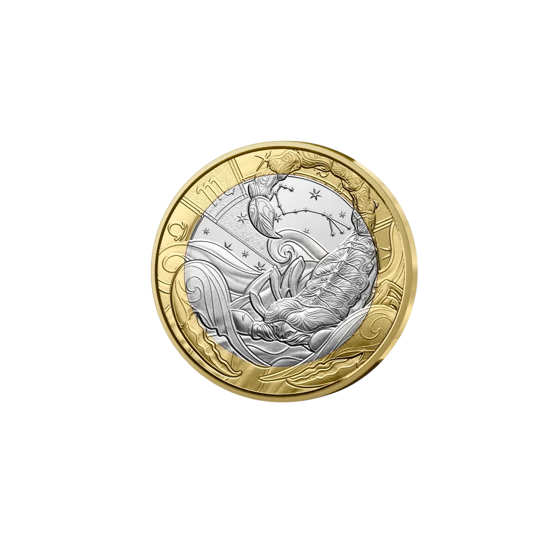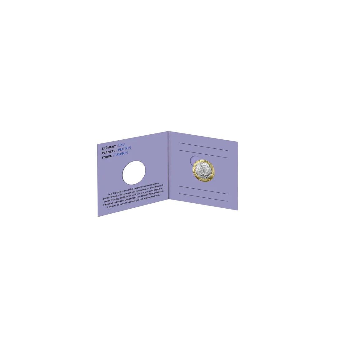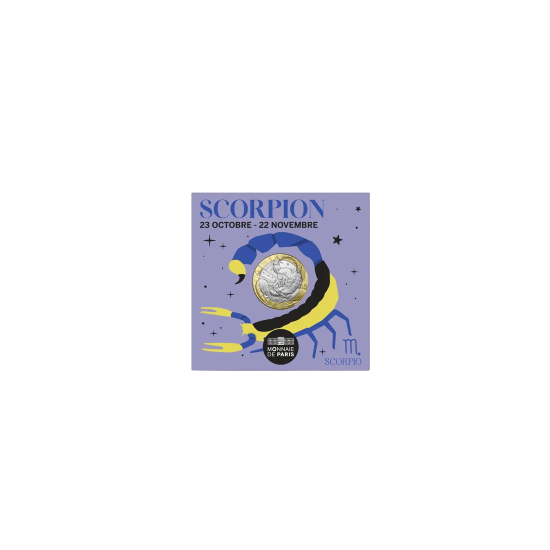 Awers monety przedstawia estetyczny i bogaty w symbolikę projekt. Na pozłacanej koronie wygrawerowano koło znaków zodiaku. Symbol Skorpiona został celowo wyeksponowany, będąc większy od pozostałych i wyróżniony piaskowanym tłem, co nadaje mu trójwymiarowego efektu głębi. Dolna część koła zodiakalnego zanurza się w motywie fal, co jest bezpośrednim nawiązaniem do Wody – żywiołu przypisanego temu intrygującemu znakowi. Centralnie umieszczony Skorpion, którego skorupa i szczypce ozdobione są misteryjnymi arabeskami, harmonijnie obejmuje okrągły kształt monety. Tło zdobi rozgwieżdżone niebo z widocznym gwiazdozbiorem Skorpiona. Ten graficznie bogaty i symbolicznie przemyślany projekt jest efektem pracy utalentowanych grawerów Monnaie de Paris, łącząc popularny motyw z mistrzowskim wykonaniem.