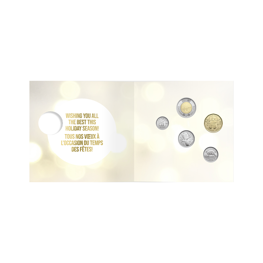 Każdy zestaw zawiera pięć kanadyjskich monet spoza ogólnego obiegu z datą 2023. Są nimi nominały: 5 centów, 10 centów, 25 centów, i 2 dolary, a także specjalna moneta jednodolarowa, przedstawiająca świątecznego łosia. Moneta ta jest dostępna wyłącznie w zestawie - została wybita właśnie na potrzeby serii upominkowej na święta 2023 r. i nie można jej nabyć samodzielnie.