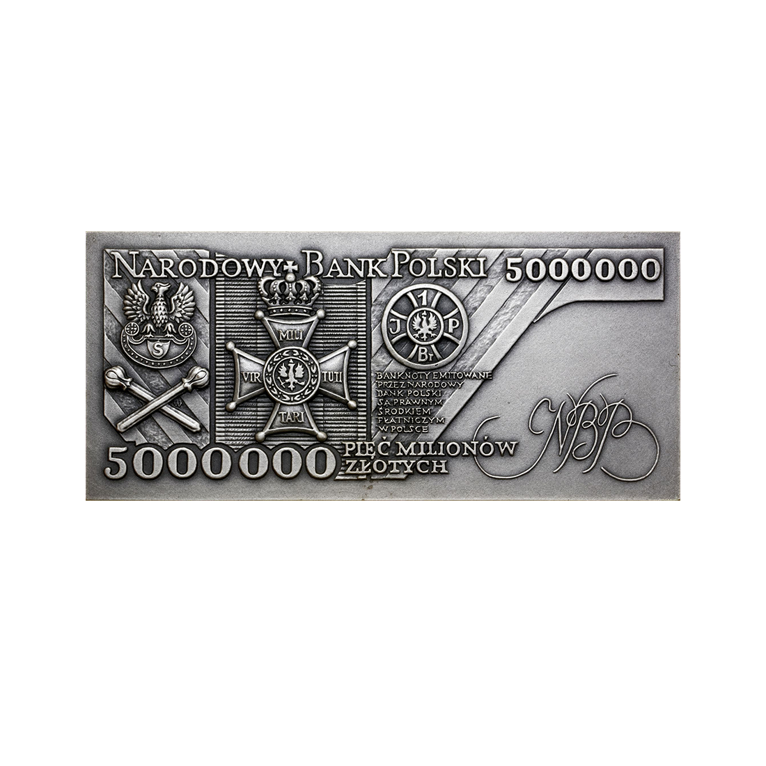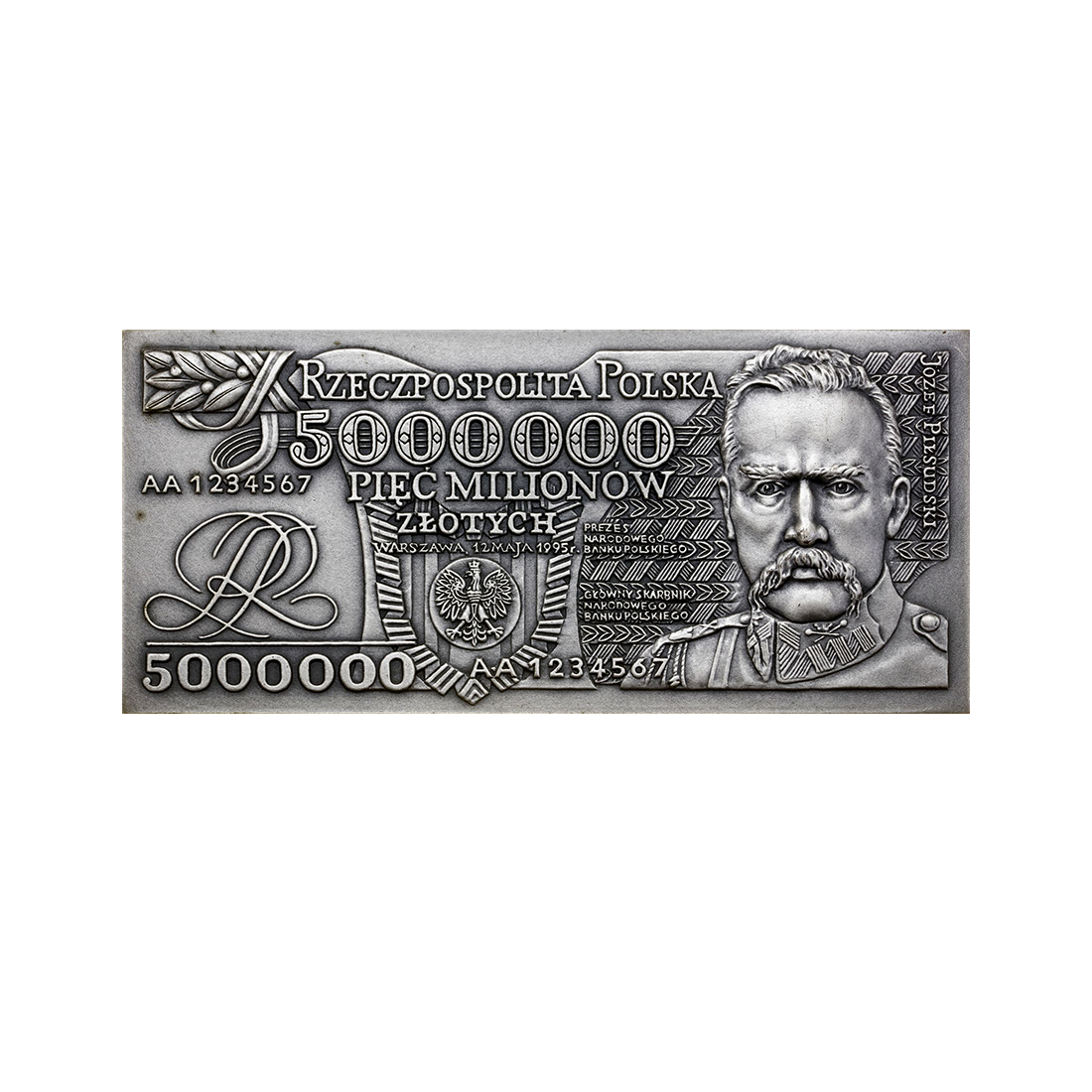 Kolekcja prezentuje się niezwykle efektownie - została zaprojektowana tak, aby łączyć walory kolekcjonerskie z historycznym przesłaniem. Najważniejszym elementem jest replika banknotu o nominale 5 milionów złotych, który nigdy nie trafił do obiegu – zachowano w nim formę klasycznego papierowego pieniądza, z charakterystycznymi detalami graficznymi nawiązującymi do lat międzywojennych. Drugim elementem jest medal wykonany w formie banknotu – odwzorowuje on układ oraz symbolikę niezrealizowanego projektu, ale w trwałej, metalowej wersji, która nadaje mu wyjątkowego charakteru i trwałości. Uzupełnieniem kompletu jest numizmatyczna forma o nietypowym kształcie, która stanowi dodatkowe dopełnienie zestawu i wzbogacają go o jeszcze jeden wymiar artystyczny. Wszystkie elementy razem tworzą spójną kompozycję pamiątkową, która nawiązuje do historii Polski i 80. rocznicy Przewrotu Majowego.