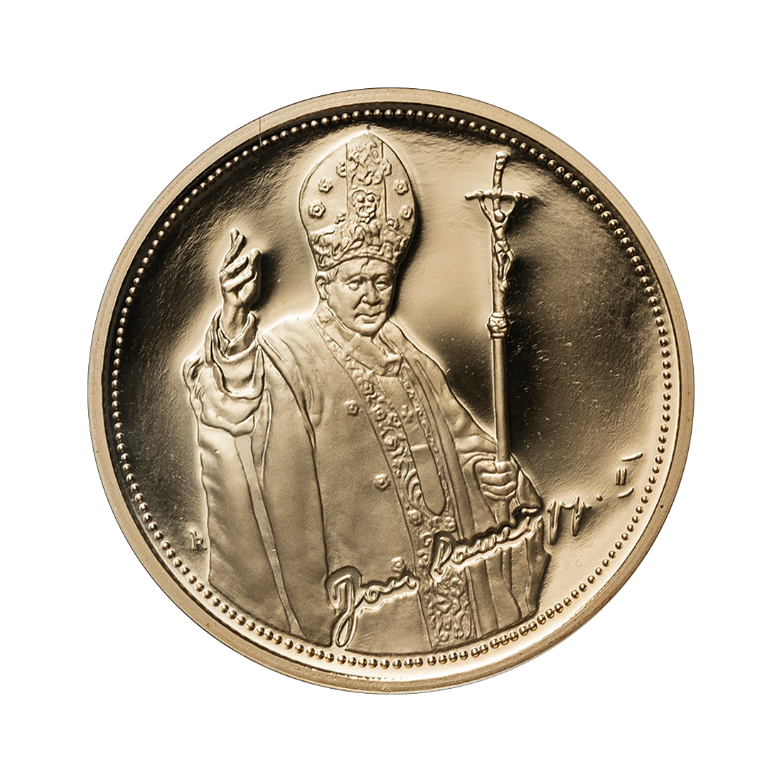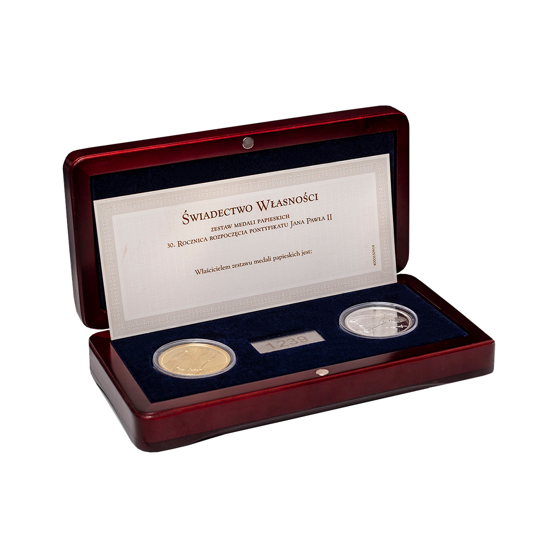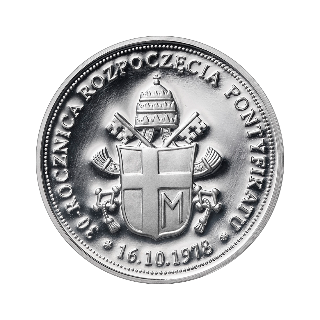 Zestaw dwóch numizmatów prezentuje się jako elegancka i symboliczna pamiątka jubileuszowa. Oba przedstawiają wizerunek papieża Jana Pawła II w pełnej postaci, z uniesioną prawą ręką, błogosławiącą wiernych. W tle widoczny jest fragment papieskiego ornatu, symboliczne elementy związane z pontyfikatem oraz podpis papieża. Na rewersie znajduje się papieski herb z tiarą i kluczami, otoczony napisem upamiętniającym 30-lecie rozpoczęcia pontyfikatu. Jeden z numizmatów platerowany jest 24-karatowym złotem, co nadaje mu dodatkowego blasku i elegancji.