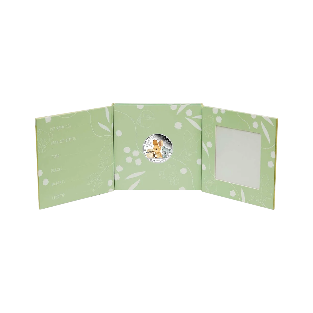 Ta moneta z 1/2 uncji srebra o próbie 999, przedstawia urocze obrazy najmilszych australijskich zwierząt. Stanowi idealny prezent na powitanie nowo narodzonych dzieci. Walor został opakowany w ilustrowaną kartę podarunkową z miejscem przeznaczonym na rodzinne zdjęcie.