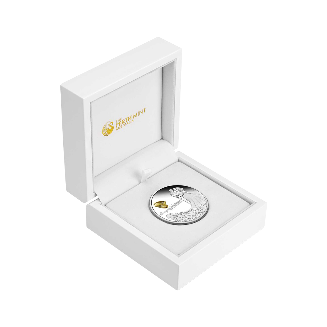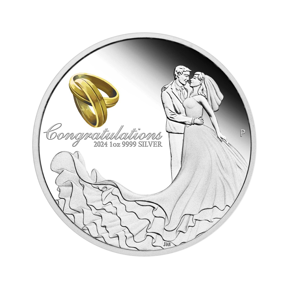 Moneta przedstawia nowożeńców w objęciach w dniu ślubu oraz dwie splecione złote obrączki ślubne. Wzór rewersu zawiera dodatkowo napis „Gratulacje” w języku angielskim oraz tradycyjny znak mennicy w Perth - literę P.