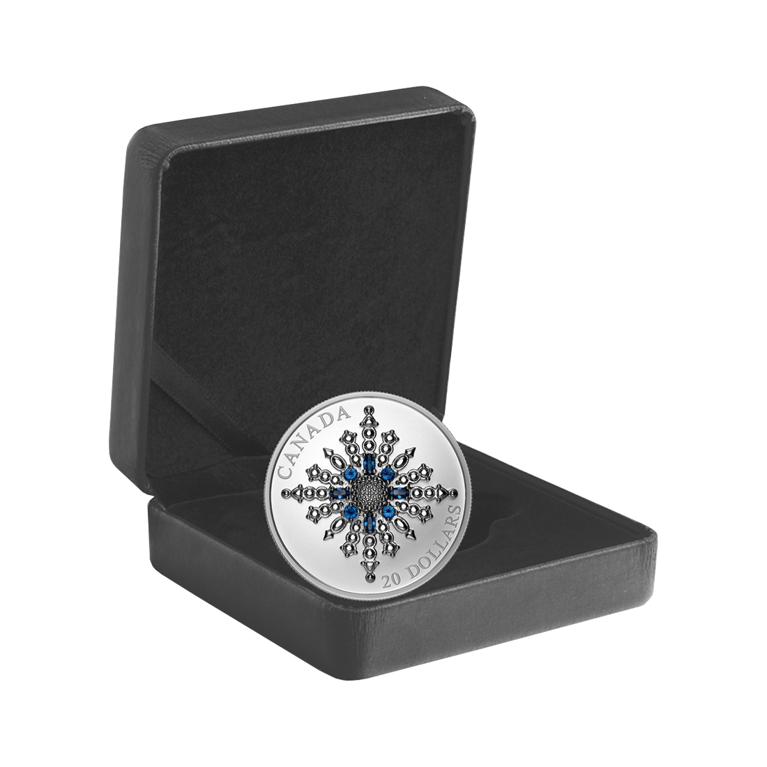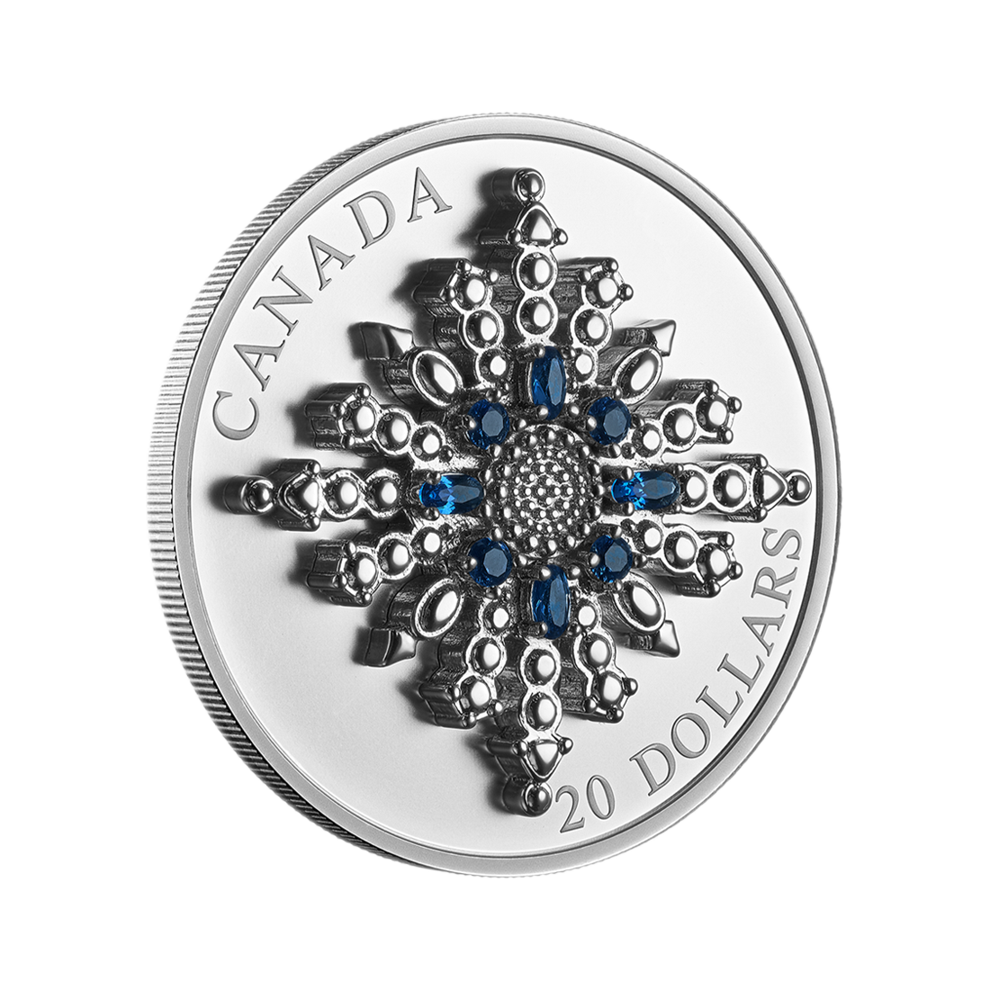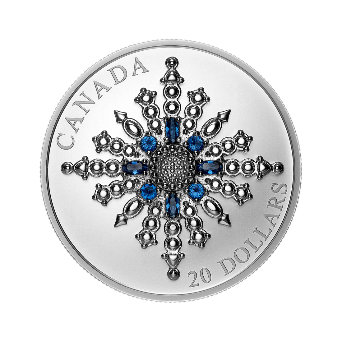 Wyjątkowa moneta z serii Crown Jewels, inspirowana delikatną elegancją płatka śniegu reprezentującego kanadyjską Arktykę. O niezwykłym uroku srebrnej monety świadczy jej rewers. Ozdobiony jest rodowanymi akcentami i starannie rozmieszczonymi kamieniami ze szkła w kolorze królewskiego błękitu, podkreślającymi diamentowo-szafirowy wzór broszki. Moneta ta stanowi olśniewające świadectwo piękna i zawiłości królewskiej pamiątki, przygotowując grunt pod niezwykłą kolekcję, celebrującą klejnoty koronne.