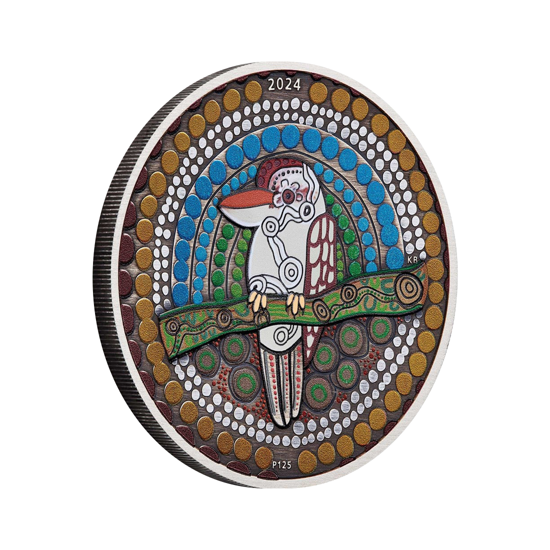 Na rewersie monety przedstawiona jest kolorowa kookaburra, siedząca na gałęzi eukaliptusa. Ozdobiona jest znakami, symbolizującymi białą ochrę - naturalny pigment ziemi, używany przez przodków podczas tańca „Kookaburra Dreaming”. Tło składa się z kolorowych kropek, ułożonych pasami. Odcienie niebieskiego reprezentują niebo w różnych porach dnia, zielone odzwierciedlają liście w sezonie Djeran (kwiecień/maj), a brązowe zarezerwowane są dla liści w sezonach Kambarang, Birak i Bunuru (październik/marzec). Projekt zawiera również znak mennicy, upamiętniający 125. rocznicę istnienia The Perth Mint. Autorem monety jest Kevin Bynder - oddany artysta i edukator, z dużym i zróżnicowanym portfolio artystycznym. Awers monety przedstawia portret Jego Wysokość Króla Karola III, autorstwa Dana Thorne’a. Podano tam również wagę monety, jej czystość i nominał. Antyczne srebrne wykończenie w tle daje efekt vintage, który kontrastuje z jasnymi, żywymi kolorami ptaka na rewersie.