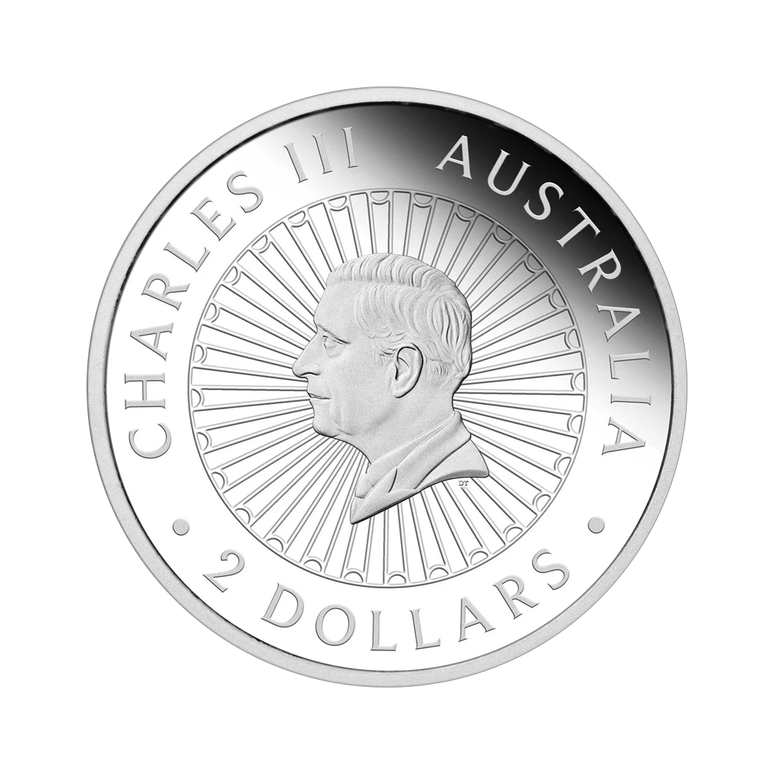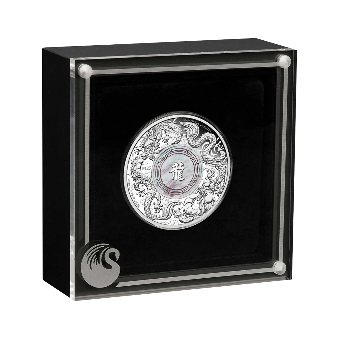 Srebrna moneta przedstawia dwa misternie szczegółowe smoki, otaczające centralną intarsję z masy perłowej, co tworzy uderzający efekt wizualny. Smoki są przedstawione z groźnymi wyrazami twarzy, wijącymi się ciałami i delikatnymi łuskami, co dodaje wrażenia ruchu i mocy. Lustrzane wykończenie monety próbnej podkreśla wzory smoków, podczas gdy intarsja z pereł zapewnia świetlisty kontrast, symbolizujący mądrość i równowagę. Rewers zawiera wizerunek króla Karola III, dodając odrobinę elegancji do całego projektu. Do monety dołączony jest ponumerowany certyfikat autentyczności, umieszczona w ozdobnym pudełku i ilustrowanym opakowaniu wysyłkowym.