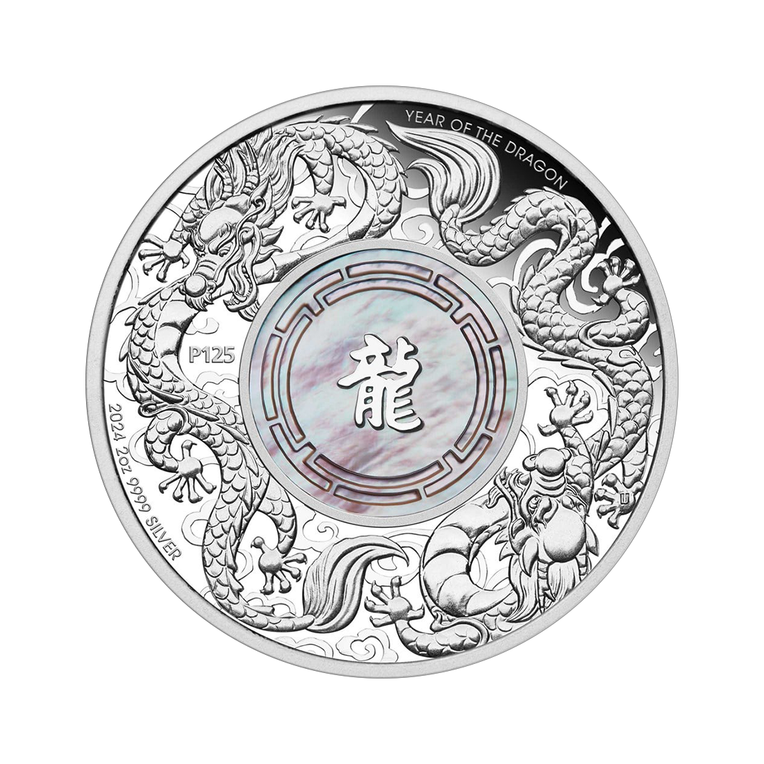 Wygląd srebrnej monety Podwójny Smok Mother of Pearl 2024 2 uncje