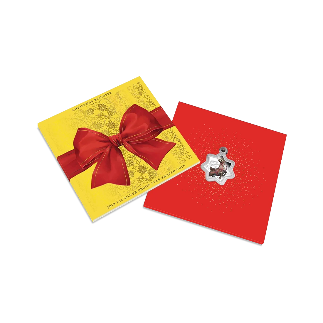 Ta urocza srebrna moneta o wadze 1 uncji trojańskiej nawiązuje do Świąt Bożego Narodzenia - jest w kształcie gwiazdy świątecznej i przedstawia renifera na tle nieba. Obok widnieje napis Merry Christmas, dlatego walor ten jest świetnym pomysłem na prezent świąteczny.