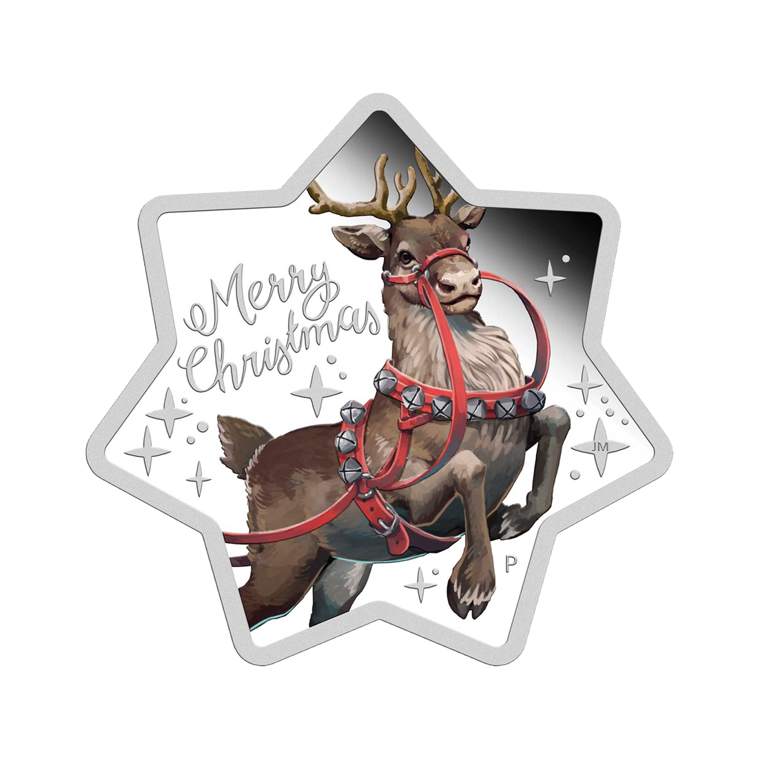Rewers monety w kształcie gwiazdy świątecznej przedstawia renifera pędzącego wśród gwiazd. Widać tu też elegancki, czerwony zaprzęg. Obok znajduje się napis Merry Christmas (Wesołych Świąt) i tradycyjny znak mennicy Perth Mint P.