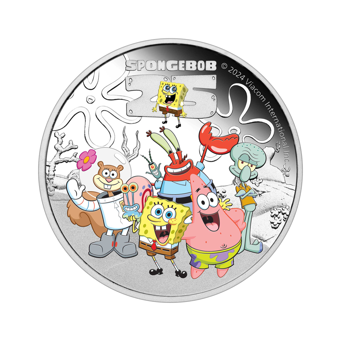 Moneta prezentuje barwną, dynamiczną scenę, przedstawiającą bohaterów kultowego serialu animowanego „SpongeBob Kanciastoporty”. W centralnej części widoczny jest uśmiechnięty SpongeBob, otoczony przez swoich przyjaciół: beztroskiego Patryka, nieco zrzędliwego Skalmara, energiczną Sandy i przedsiębiorczego Pana Kraba. W tle znajdują się detale charakterystyczne dla podwodnego świata Bikini Dolnego, takie jak morska roślinność i pastelowe odcienie tła, które podkreślają żywiołowy charakter sceny. Krawędź monety jest gładka, a jej awers zdobi wizerunek króla Karola III wraz z informacjami o nominale, wadze i czystości srebra. Kolorowy rewers, wykonany z niezwykłą precyzją, sprawia, że moneta przyciąga uwagę nie tylko jako przedmiot kolekcjonerski, ale także jako małe dzieło sztuki inspirowane popkulturą.