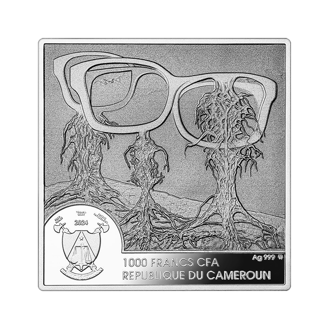 Centralnym motywem awersu są trzy antropomorficzne postacie przypominające drzewa z rozgałęzionymi korzeniami, które wznoszą się na tle abstrakcyjnego krajobrazu. Nad nimi znajduje się ogromna para okularów, symbolizująca być może metaforyczną wizję lub spojrzenie artysty na świat. W dolnej części widnieje herb Kamerunu, wskazujący na emitenta monety oraz napis informujący o nominale, próbie srebra i roku emisji. Całość utrzymana jest w monochromatycznej, precyzyjnej stylistyce z wyraźnymi detalami charakterystycznymi dla dzieł Beksińskiego. Brzeg monety jest gładki, a jakość wykonania została oznaczona jako proof, co świadczy o jej wysokiej precyzji i połysku.