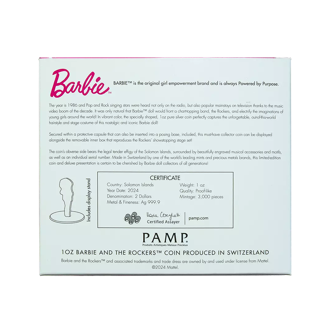 Projekt ma swoje korzenie w dwóch niezwykle popularnych i kultowych zjawiskach popkultury oraz historii numizmatyki. Powstanie monety łączy ikonę mody i stylu – lalkę Barbie – z dziedzictwem srebrnych monet kolekcjonerskich emitowanych przez Wyspy Salomona. „Barbie and the Rockers” była jedną z najbardziej kultowych serii lalek, stworzonych przez firmę Mattel w połowie lat 80. XX wieku. Została ona zaprojektowana w odpowiedzi na popularność muzyki pop i rock tamtych czasów. Barbie i jej zespół byli ubrani w neonowe stroje z charakterystycznymi, rockowymi akcentami, takimi jak cekiny, legginsy i fryzury z dużą objętością, co idealnie oddawało modę tamtejszych lat.