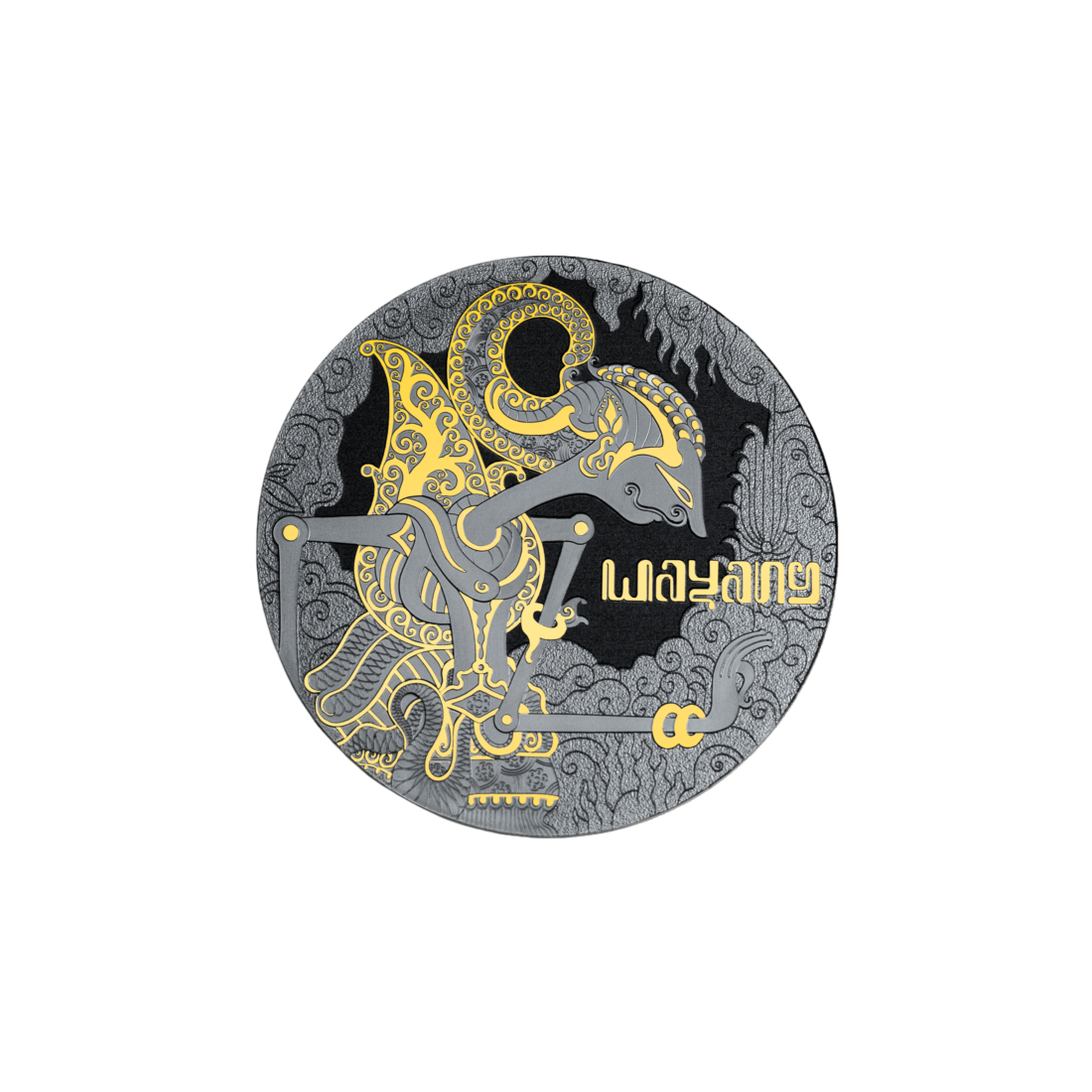 Teatr cieni Wayang od wieków zachwyca swoją unikalnością. Przedstawienia opowiadają o mitologicznych bohaterach, duchowych naukach i życiowych lekcjach, a każdy spektakl realizowany jest z ogromnym kunsztem i dbałością o detale. Motyw monety przedstawia jedną z klasycznych postaci teatru Wayang, ukazaną w charakterystycznej stylizacji. Detale, takie jak misternie wyryte wzory na postaci i ozdobach, oddają ducha tej tradycyjnej sztuki.