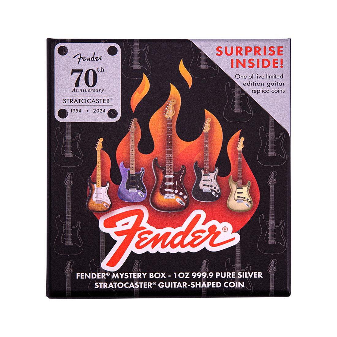 Srebrna moneta, wydana z okazji 70. rocznicy gitary Fender Stratocaster. Jest to specjalny przedmiot kolekcjonerski, upamiętniający siedem dekad wpływu tego kultowego instrumentu. Egzemplarz został wykonany z misternymi szczegółami, aby uchwycić istotę tej legendarnej gitary elektrycznej. Moneta dostępna jest w pięciu unikalnych wzorach, które sprzedawane są losowo. Wykonana jest z czystego srebra, z wykończeniem lustrzanym. Do każdego egzemplarza dołączony jest certyfikat autentyczności i specjalnie zaprojektowane etui. Seria jest ograniczona do zaledwie 5000 sztuk na całym świecie, co czyni ją pozycją obowiązkową dla miłośników muzyki i monet.