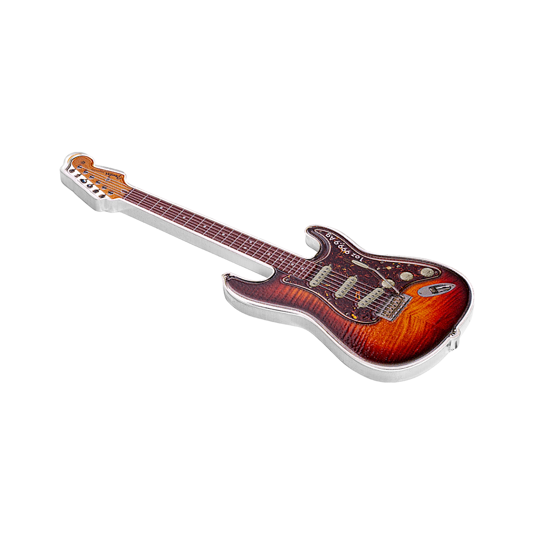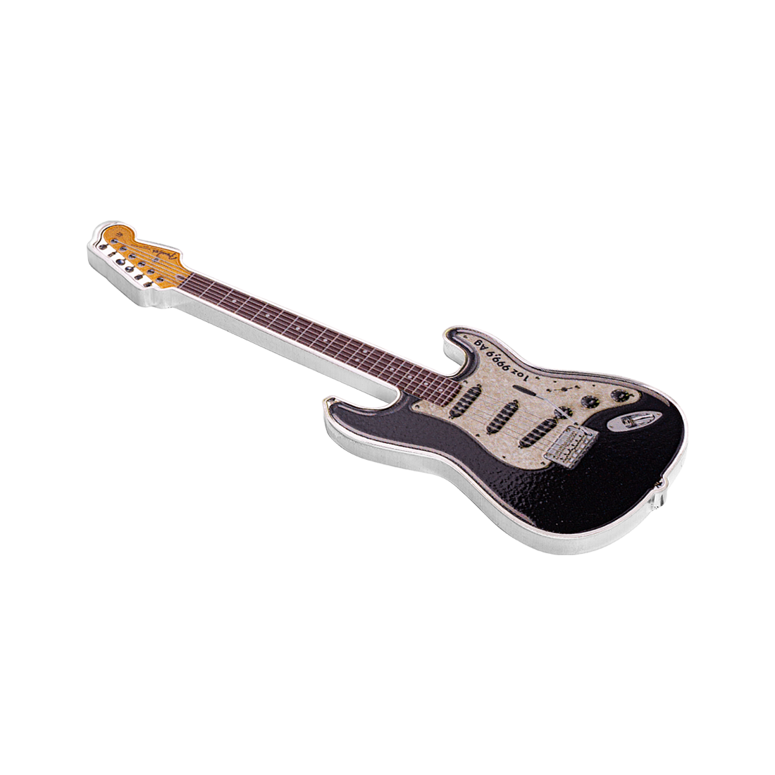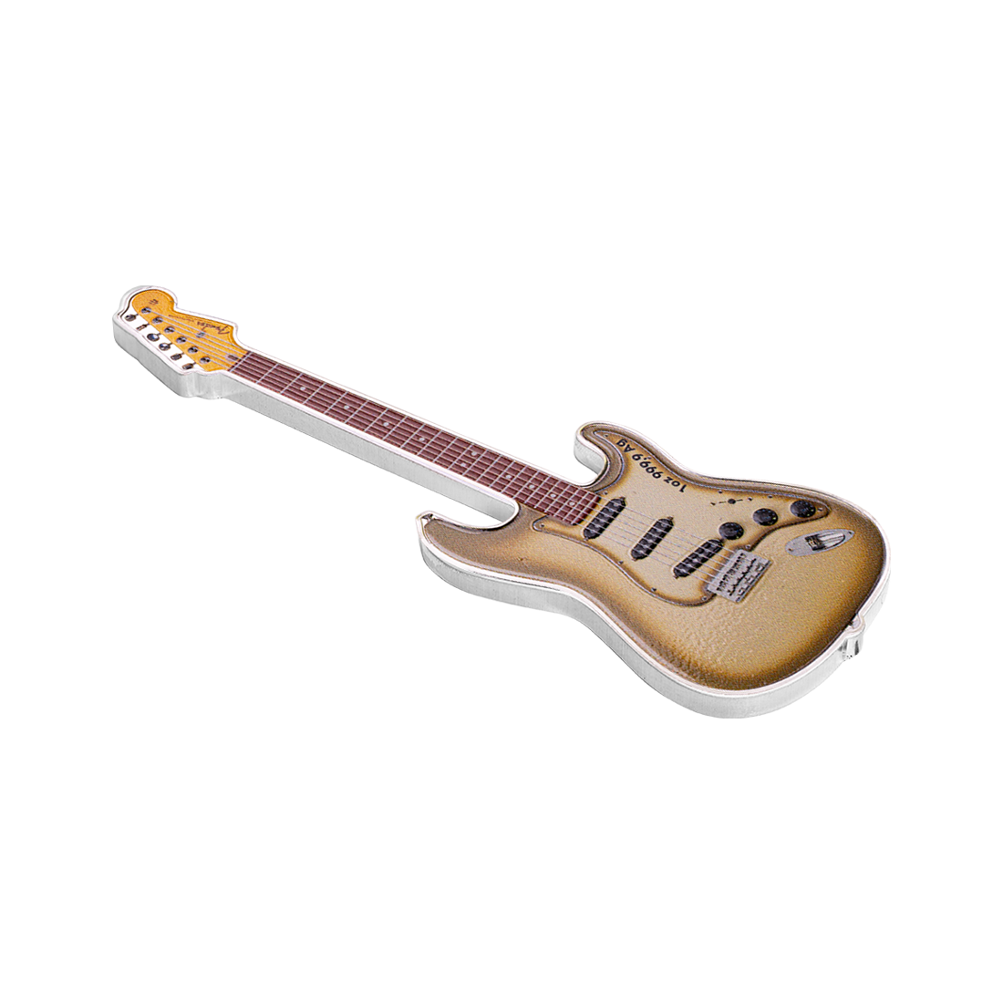 Wyjątkowy wyrób z jednej uncji srebra, o kształcie miniaturowej gitary elektrycznej, odzwierciedlając ikonę w świecie muzyki – model Fender Stratocaster. Na rewersie widnieje szczegółowy obraz instrumentu, w wyraźnie zarysowanymi detalami, a także napisem, mówiącym o okrągłej rocznicy wydania. Awers natomiast przedstawia portret Królowej Elżbiety II wraz z informacjami o kraju emisji, wartości nominalnej, wadze i czystości srebra. Moneta jest wykonana w jakości proof i dostarczana w eleganckim etui, wraz z certyfikatem autentyczności. Projekt oddaje hołd gitarze znanej z eleganckiego designu i wszechstronnego brzmienia, uwielbianej przez muzyków od momentu jej wprowadzenia na rynek w 1954 roku.