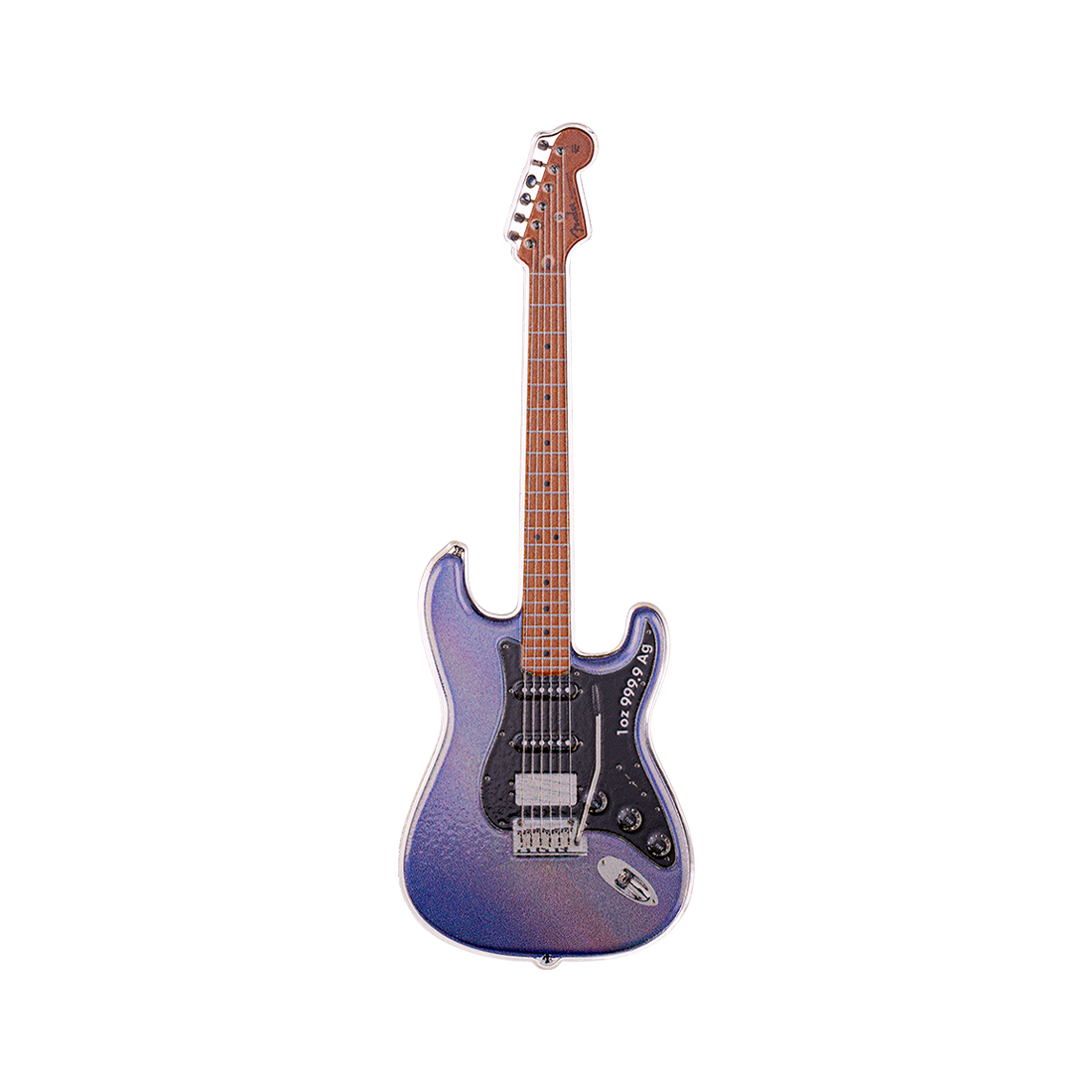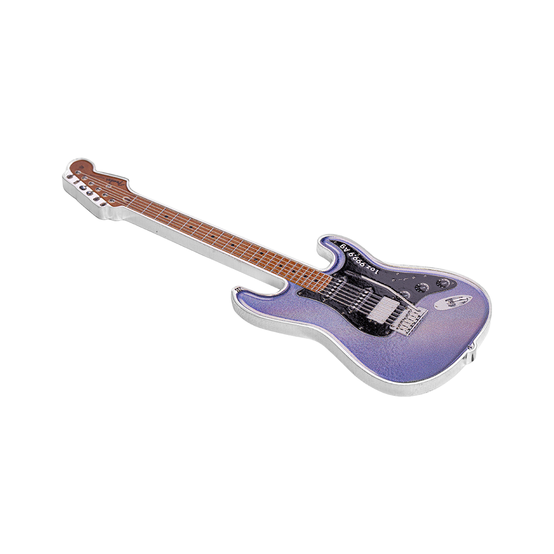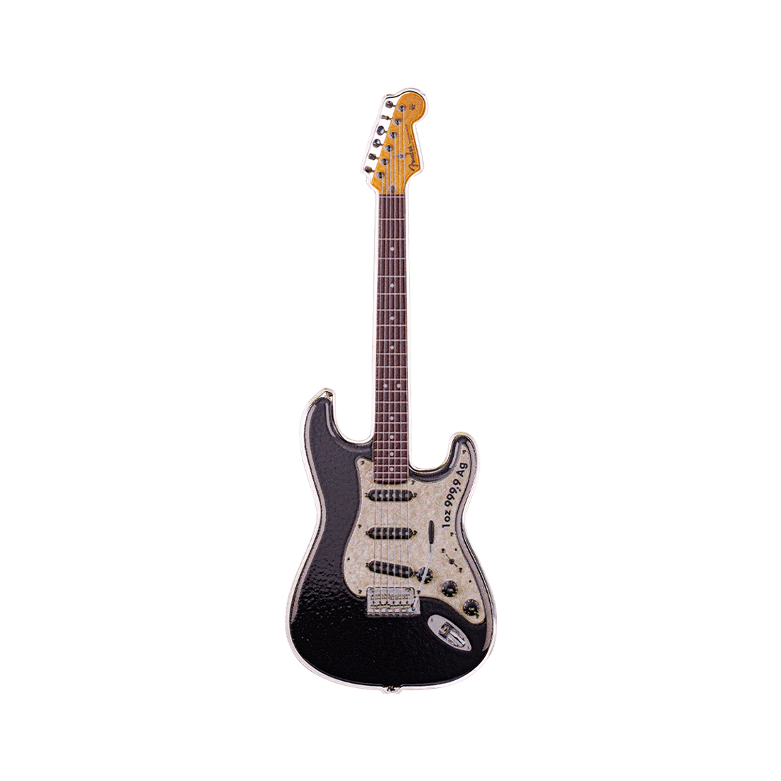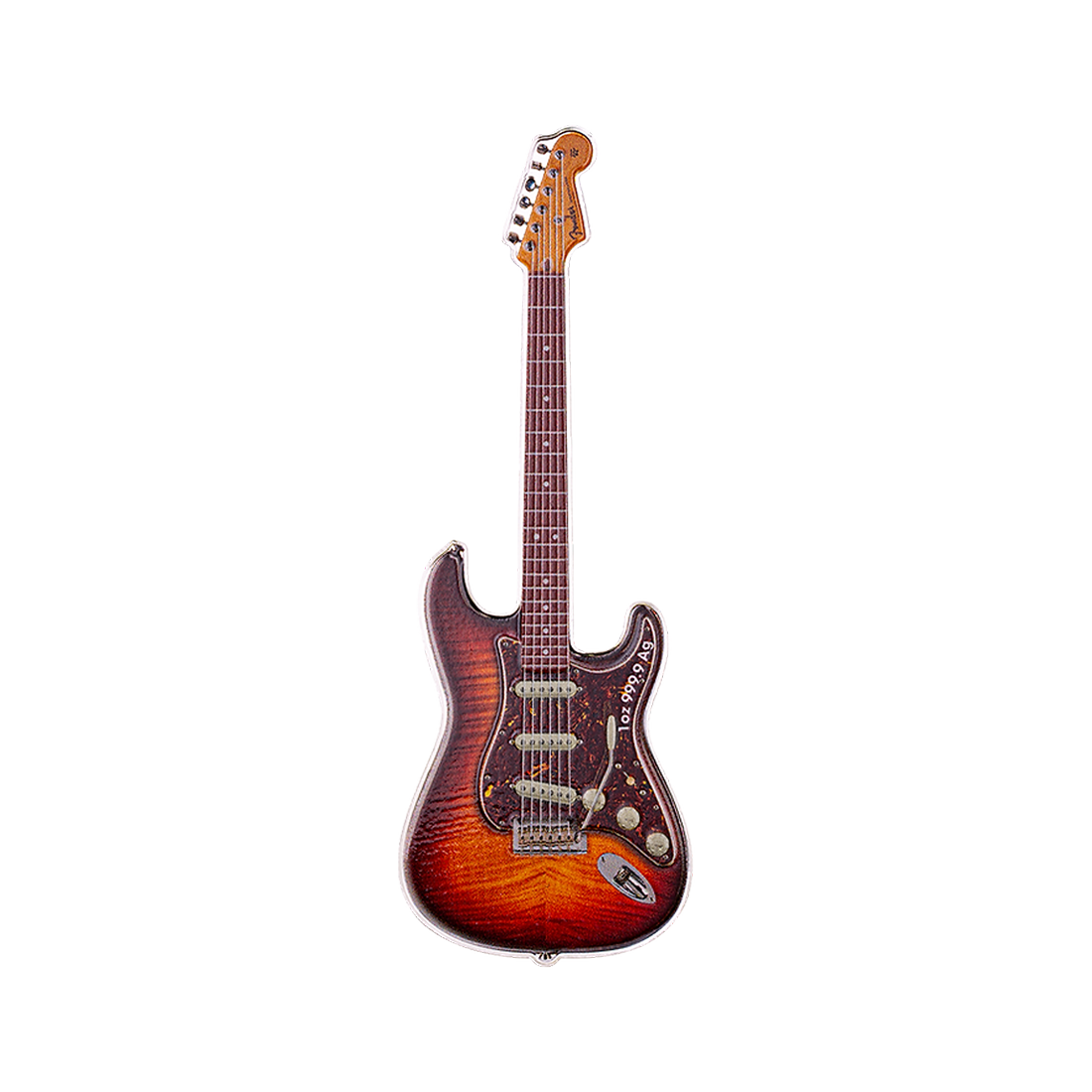 Wyjątkowy wyrób z jednej uncji srebra, o kształcie miniaturowej gitary elektrycznej, odzwierciedlając ikonę w świecie muzyki – model Fender Stratocaster. Na rewersie widnieje szczegółowy obraz instrumentu, w wyraźnie zarysowanymi detalami, a także napisem, mówiącym o okrągłej rocznicy wydania. Awers natomiast przedstawia portret Królowej Elżbiety II wraz z informacjami o kraju emisji, wartości nominalnej, wadze i czystości srebra. Moneta jest wykonana w jakości proof i dostarczana w eleganckim etui, wraz z certyfikatem autentyczności. Projekt oddaje hołd gitarze znanej z eleganckiego designu i wszechstronnego brzmienia, uwielbianej przez muzyków od momentu jej wprowadzenia na rynek w 1954 roku.