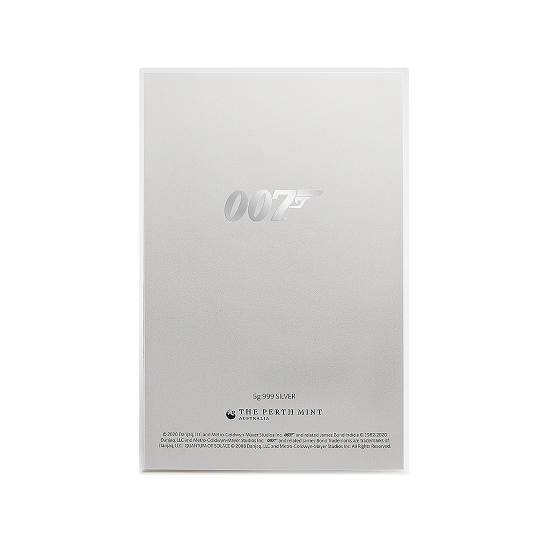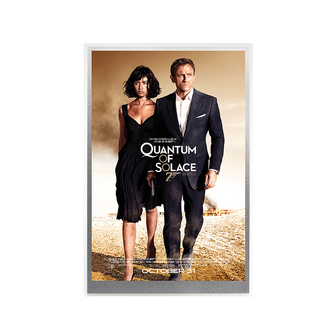 Plakat filmowy „Quantum of Solace” z 2020 roku, wydany na 5-gramowej srebrnej folii o efektownym, przyciągającym wzrok wyglądzie. W centrum znajdują się dwie postacie - James Bond, wraz z sekretną agentką. Oboje ukazani są w bojowej postawie, gotowi do akcji. Tło plakatu to krajobraz z filmu, z dominującymi odcieniami beżu, bieli i szarości, które tworzą tajemniczą i napiętą atmosferę. Całość wykonana jest na lśniącej srebrnej folii, która podkreśla kontrasty i głębię kolorów, sprawiając, że plakat ma wyjątkowy połysk, dostrzegalny szczególnie w świetle. Subtelne refleksy sprawiają, że obraz zdaje się ożywać, dając wrażenie, jakby scena z filmu miała zaraz wyjść poza kadr. Plakat okazany jest w przezroczystej, akrylowej ramce, która nadaje się zarówno do zamontowania na ścianie, jak i ustawienia na biurku w pozycji pionowej.