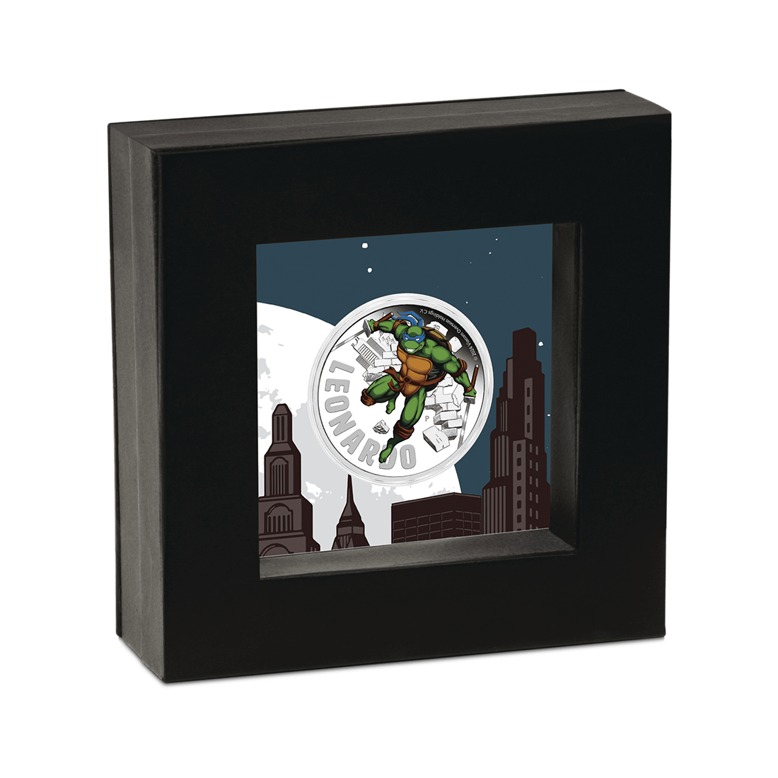 Moneta została wybita przez renomowaną mennicę The Perth Mint z okazji 40-lecia serii „Wojownicze Żółwie Ninja”. Kultowe postacie, stworzone w 1984 roku przez Kevina Eastmana i Petera Lairda, początkowo pojawiły się w komiksach jako niezależna publikacja, jednak dosyć szybko zdobyła popularność. Seria przeniknęła do popkultury dzięki animowanym serialom, filmom, zabawkom oraz licznym adaptacjom, stając się jednym z najbardziej rozpoznawalnych fenomenów medialnych na świecie. Moneta upamiętnia Leonarda, lidera grupy, który od lat symbolizuje honor, dyscyplinę i determinację. Wybita z czystego srebra i wyprodukowana w limitowanym nakładzie, stanowi hołd dla dziedzictwa Żółwi Ninja oraz ich wpływu na kolejne pokolenia fanów.