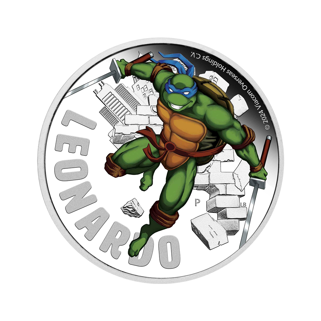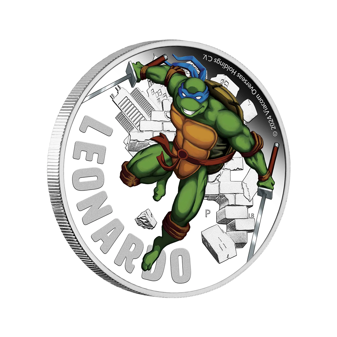 Moneta przedstawia kolorową postać Leonarda, jednego z Wojowniczych Żółwi Ninja. Ukazany jest w bojowej pozie na rewersie, ze swoimi charakterystycznymi mieczami katana w dłoniach. Jest otoczony detalicznym, miejskim tłem, nawiązującym do komiksowego i animowanego stylu serii. W tle znajduje się też jego imię. Awers monety zdobi oficjalny portret Jego Królewskiej Mości Króla Karola III, autorstwa Jody’ego Clarka, wraz z nazwą emitenta, rokiem emisji, wagą, próbą srebra oraz nominałem. Moneta charakteryzuje się wysokiej jakości wykończeniem typu proof, co oznacza lustrzaną powierzchnię tła i matowe detale, podkreślające precyzję wykonania.