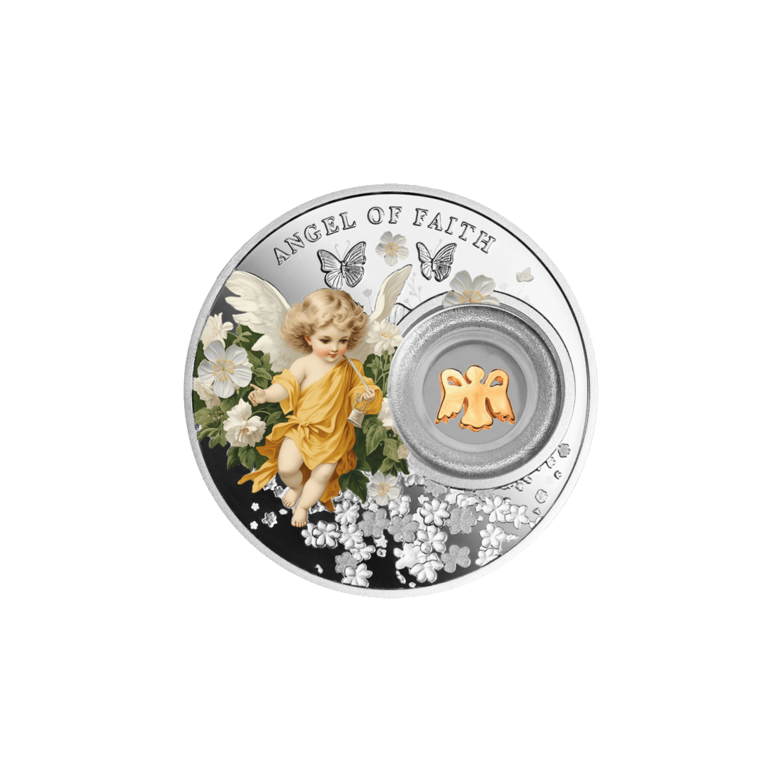 Moneta „Anioł Wiary” wyróżnia się nie tylko wysoką próbą srebra, ale także unikalnym designem. Centralnym elementem rewersu jest wizerunek anioła, symbolizującego opiekuńczą moc i duchowe wsparcie. Postać anioła została misternie zdobiona filigranowym elementem pokrytym 24-karatowym złotem, co nadaje monecie wyjątkowego blasku i prestiżu. Dodatkowo, zastosowanie druku cyfrowego o fotograficznej jakości oraz mikrodruku podkreśla precyzję i dbałość o detale.