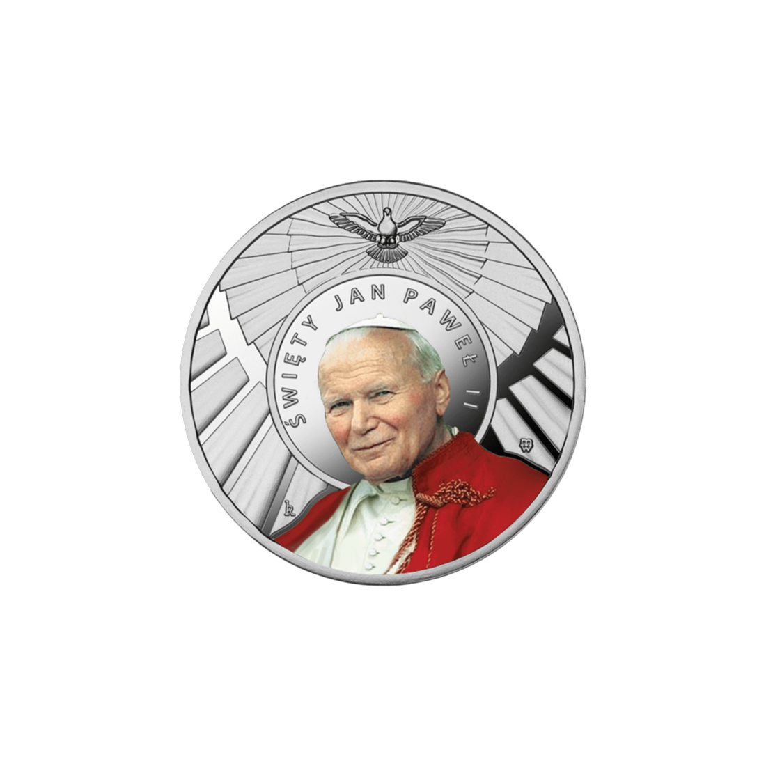 Rewers monety zdobi realistyczny portret papieża Polaka w bogato zdobionych szatach liturgicznych, podkreślających jego duchowy autorytet. Dodatkowo moneta zawiera inskrypcję „ŚWIĘTY JAN PAWEŁ II”, co jeszcze bardziej podkreśla jej unikalny charakter. Nad postacią widnieje symbol Ducha Świętego, który nawiązuje do pontyfikatu papieża i jego niezachwianej wiary. W tle dostrzec można promieniste zdobienia, nadające monecie majestatyczny wygląd.