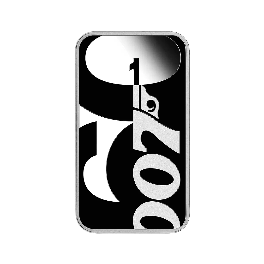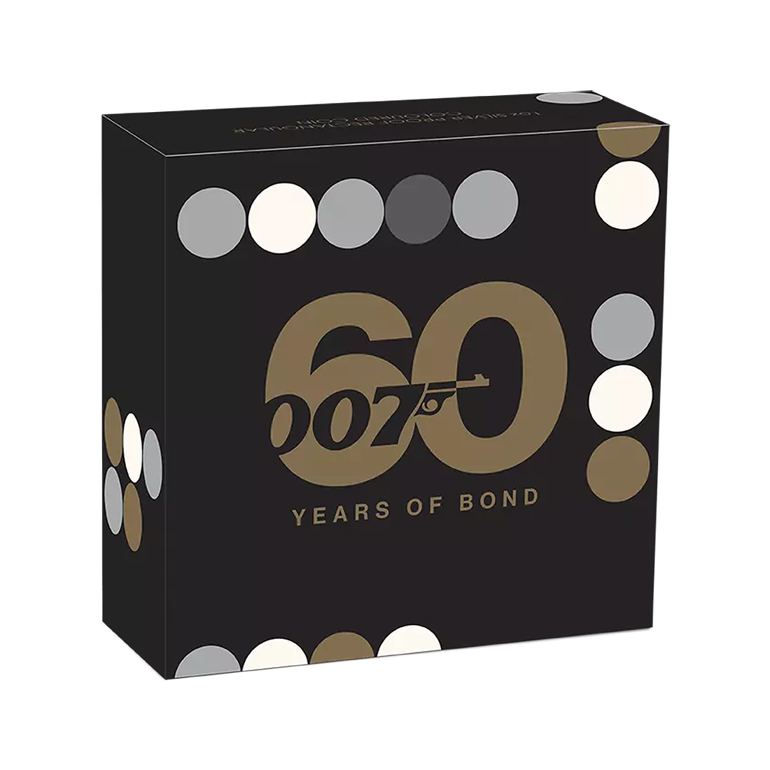 Prostokątny egzemplarz wyróżnia się spośród tradycyjnych, okrągłych monet. Wykonany jest z czystego srebra, co nadaje eleganckiego, lśniącego wyglądu. Na awersie widnieje portret Królowej Elżbiety II, zgodny z tradycyjnym wzorem monet. Rewers natomiast przyciąga wzrok czarno-białym projektem, który oddaje hołd 60-leciu serii filmów o Jamesie Bondzie. Przedstawia on ikoniczne logo serii, na które składają się cyfry 007 i projekt pistoletu. Dzięki ukazaniu tego w dwóch kolorach, ilustracja nabiera głębi, elegancji i tajemniczości. Detale są precyzyjnie wykończone, a specjalna technika proof nadaje monecie lustrzanej powierzchni, podkreślając każdy detal. Elegancję monety podkreśla dedykowane opakowanie.