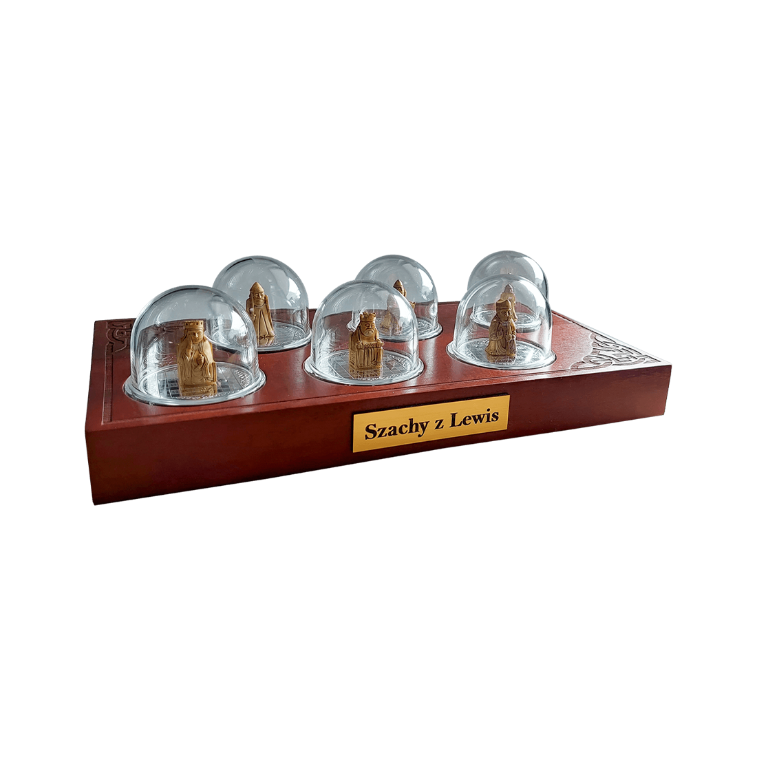 Elegancka kolekcja inspirowana słynnymi „Szachami z Lewis”. Składa się z pięciu figur szachowych, umieszczonych pod przezroczystymi kopułkami, które chronią je przed uszkodzeniem i kurzem. Figury są precyzyjnie odwzorowane, oddając historyczny charakter oryginalnych pionków. Całość umieszczona jest na drewnianej podstawie o głębokim brązowym odcieniu, z grawerowanymi zdobieniami na bokach. Na froncie podstawy znajduje się mosiężna tabliczka z napisem. Każda figura spoczywa na ozdobnej, okrągłej podstawce z metalicznym wzorem przypominającym szachownicę. Zestaw emanuje historycznym charakterem i elegancją, łącząc elementy kolekcjonerskie z wysoką jakością wykonania.