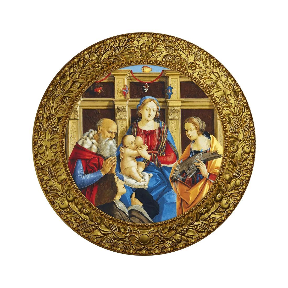 Opis srebrnej monety Michelangelo di Pietro, Madonna z dzieciątkiem, świętą Katarzyną i darczyńcą - Wesołych Świąt