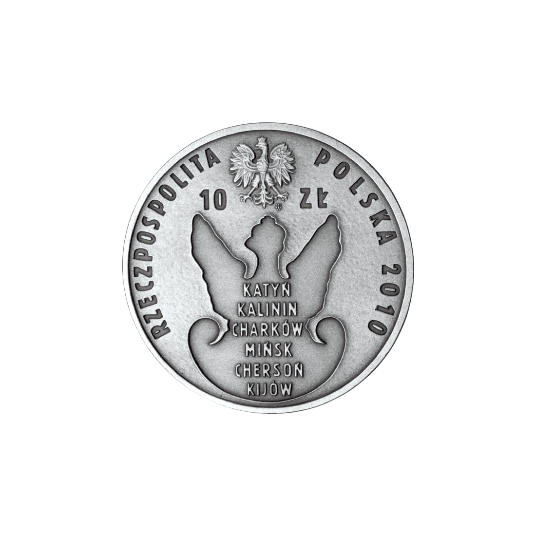 Awers monety przedstawia wizerunek orła ustalony dla godła Rzeczypospolitej Polskiej. Po bokach łap orła umieszczono napis "10-ZŁ". Poniżej, na tle konturu polskiego orła wojskowego, znajdują się nazwy miejsc związanych ze zbrodnią katyńską: "KATYŃ", "KALININ", "CHARKÓW", "MIŃSK", "CHERSOŃ", "KIJÓW". Z lewej strony półkolem widnieje napis "RZECZPOSPOLITA", z prawej "POLSKA 2010".