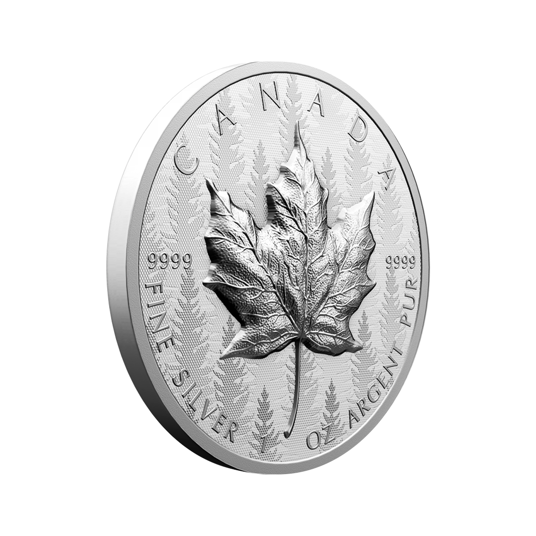 Wygląd srebrnej monety Kanadyjski Liść Klonowy 1 uncja 2024 Ultra High Relief