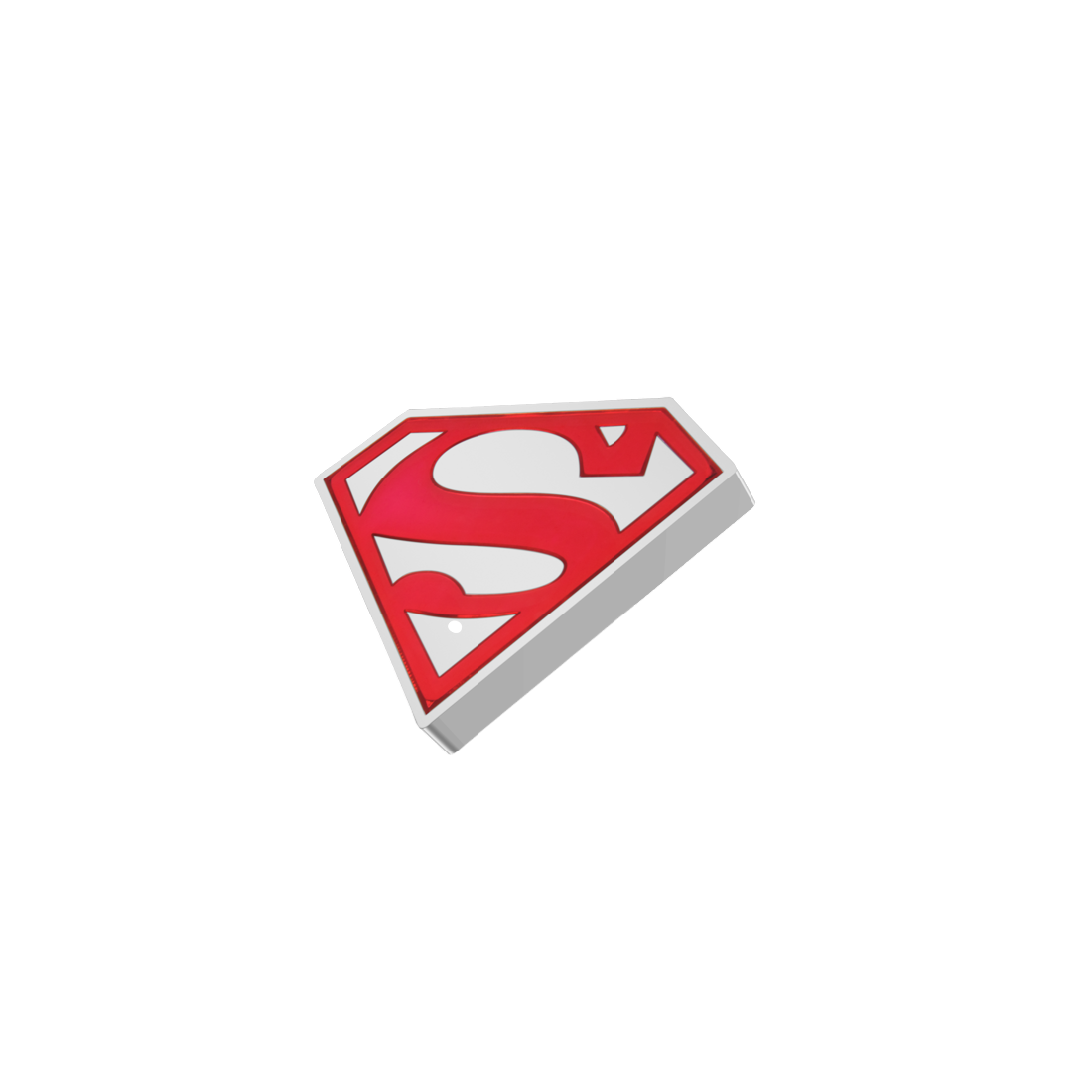 Rewers monety to odwzorowanie tarczy Supermana. Charakterystyczna litera „S” została podkreślona kolorem czerwonym, a lustrzane wykończenia sprawiają, że srebro pięknie mieni się w świetle.