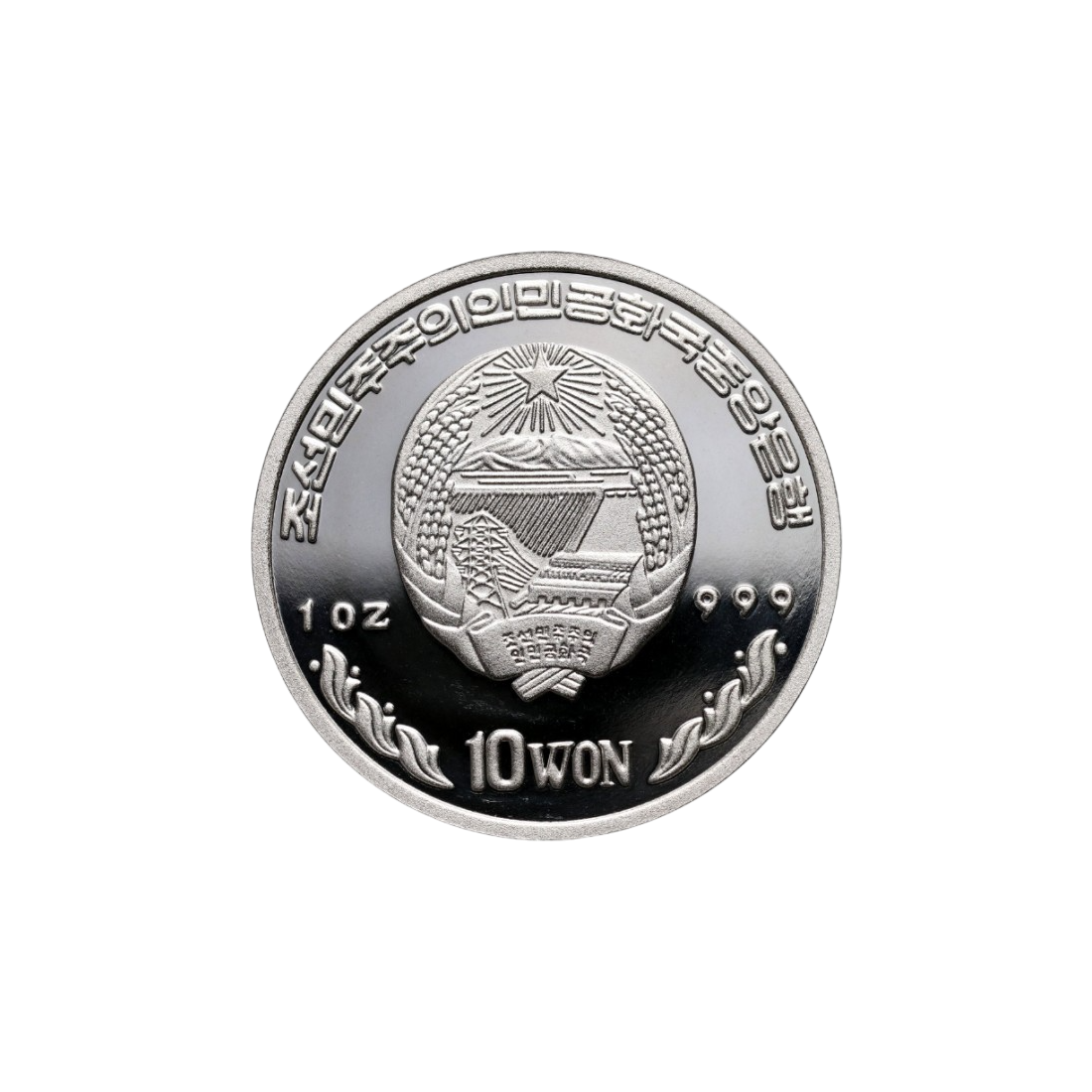 Awers monety przedstawia herb narodowy Korei Północnej, pod którym umieszczono informacje o wadze i czystości srebra: "1 OZ 999", oraz nominał "10 WON". Napis w języku koreańskim oznacza "Centralny Bank Koreańskiej Republiki Ludowo-Demokratycznej".