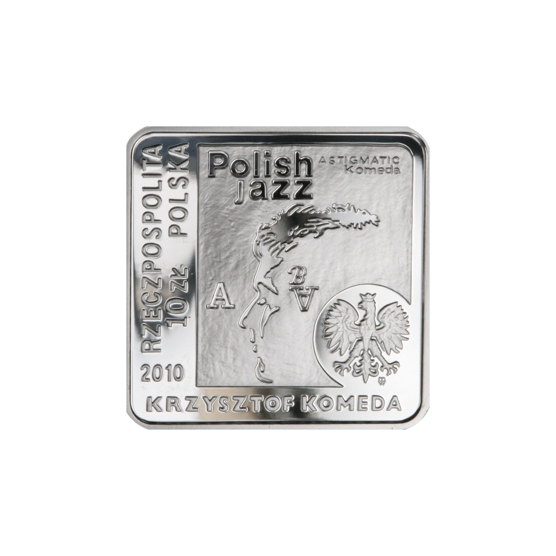 Awers monety przedstawia stylizowany wizerunek okładki albumu „Astigmatic” Krzysztofa Komedy, z profilowym portretem artysty oraz wkomponowanymi literami A i B. W górnej części umieszczono napisy „Polish jazz” oraz „ASTIGMATIC KOMEDA”. Z lewej strony, prostopadle, znajduje się napis „RZECZPOSPOLITA POLSKA”, a poniżej oznaczenie roku emisji „2010” oraz nominał „10 ZŁ”. Pod lewą łapą orła umieszczono znak mennicy: „M/W”.