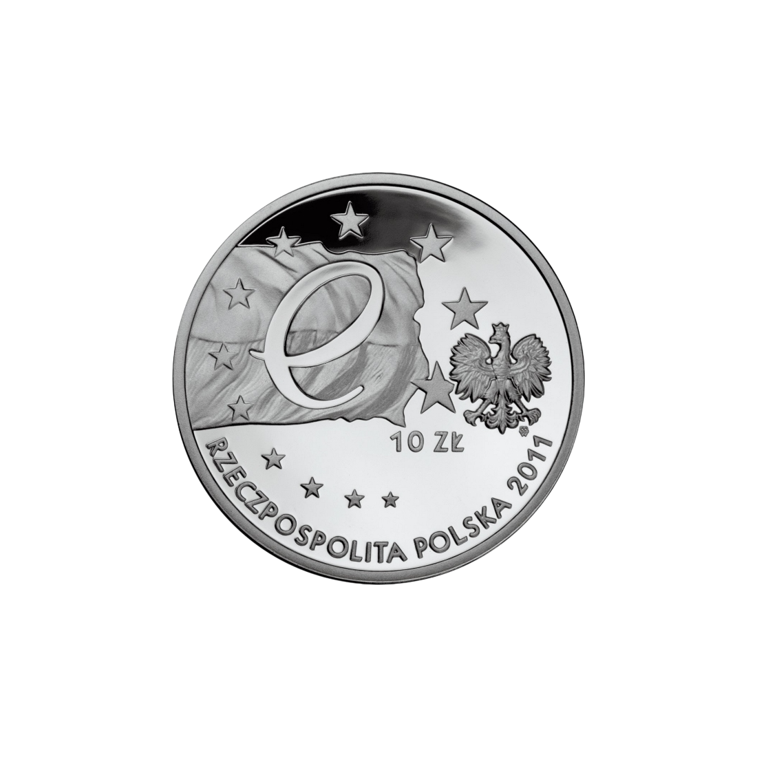 Awers monety przedstawia z prawej strony wizerunek orła ustalony dla godła Rzeczypospolitej Polskiej. Na lewo od orła, u dołu, znajduje się napis "10 ZŁ". Po lewej stronie, u góry, umieszczono stylizowaną literę „e” na tle flagi Rzeczypospolitej Polskiej, której zakończenie tworzy kontury fragmentu terytorium Polski. Flagę otacza dwanaście gwiazdek, a u dołu, półkolem, widnieje napis "RZECZPOSPOLITA POLSKA 2011". Pod lewą łapą orła znajduje się znak mennicy: M/W .