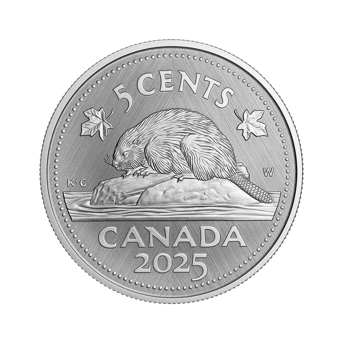 Jednouncjowa srebrna moneta kolekcjonerska, której projekt stanowi hołd dla klasycznego wzoru kanadyjskiej pięciocentówki. Na rewersie widnieje historyczny motyw bobra siedzącego na żeremiu, otoczonego wodą i naturalnym krajobrazem. Jest to wzór autorstwa Thomasa Shingleya, po raz pierwszy wykorzystany w 1937 roku. Charakterystycznym elementem jest również znak menniczy „W”, który wskazuje na miejsce produkcji – mennicę w Winnipeg, co czyni tę emisję szczególnie wyjątkową. Awers monety zdobi oficjalny wizerunek króla Karola III, autorstwa Davida C. Rossa. Całość wykonana jest w stylu „tailored specimen”, który łączy satynowe tło z precyzyjnie wypolerowanymi detalami, tworząc elegancką i nowoczesną kompozycję. Gładka krawędź monety oraz staranne wykończenie podkreślają jej kolekcjonerski charakter i kunszt menniczy The Royal Canadian Mint.