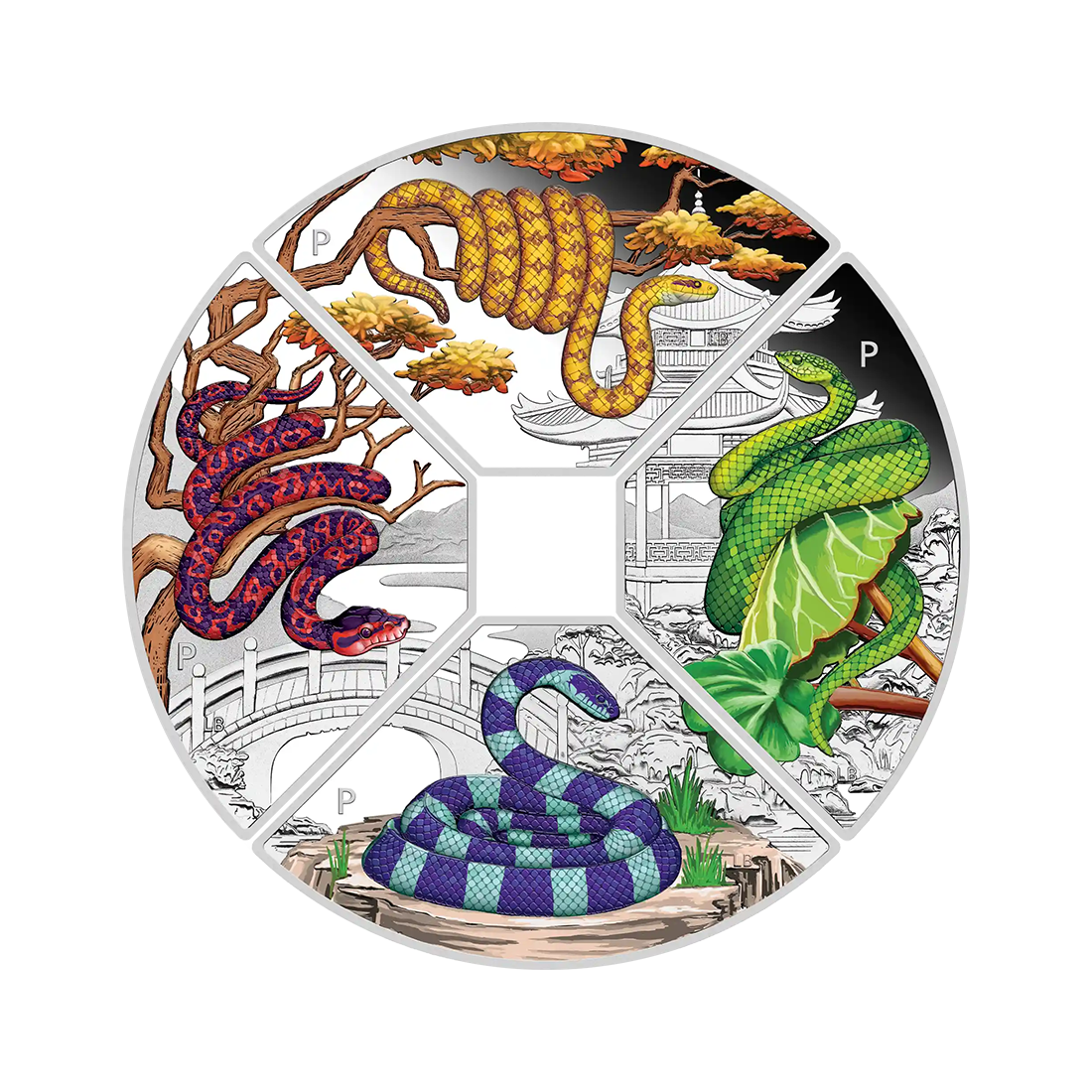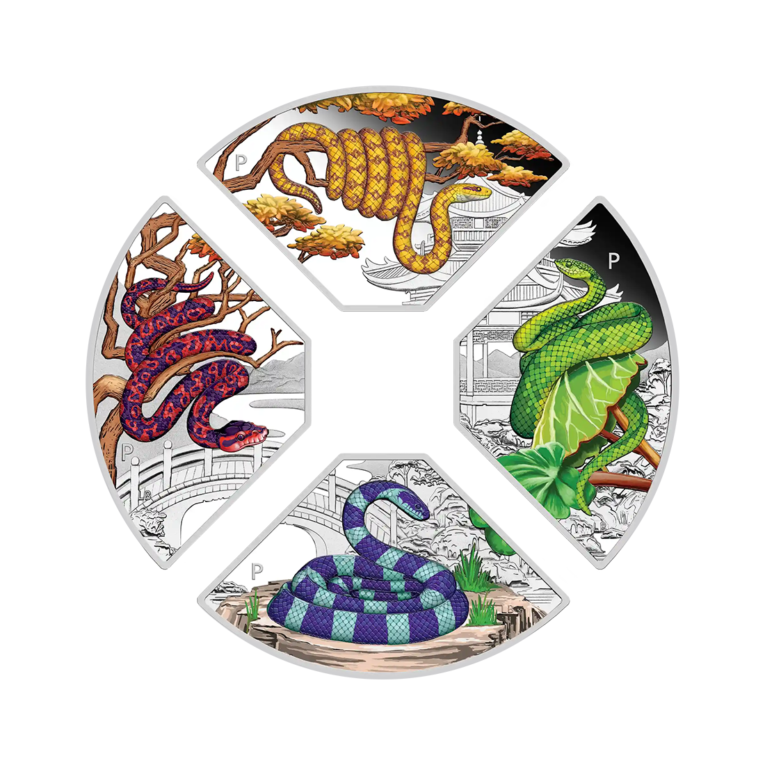 Prezentowana kolekcja składa się z czterech srebrnych monet o masie jednej uncji każda, które razem tworzą spójną całość w kształcie koła. Na rewersach kolorowych monet przedstawiono scenę z wężami wijącym się wśród kwitnących gałęzi wiśni – symboli długowieczności, odrodzenia i szczęścia w kulturze chińskiej. Każdy segment zawiera węża w innym kolorze na fragmencie tła, który staje się artystyczną kompozycją po złożeniu wszystkich części. Na awersie każdej monety znajduje się portret Jego Królewskiej Mości Króla Karola III, zaprojektowany przez Danę Samson, wraz z oznaczeniem nominału, roku emisji, masy i próby srebra. Monety mają subtelnie wykończoną powierzchnię typu proof, z kontrastem pomiędzy lustrzanym tłem a matowymi detalami. Całość zaprezentowana jest w stylowym, kwadratowym etui z przezroczystym wiekiem, które umożliwia eksponowanie pełnego wizerunku, a także dołączonym numerowanym certyfikatem autentyczności.
