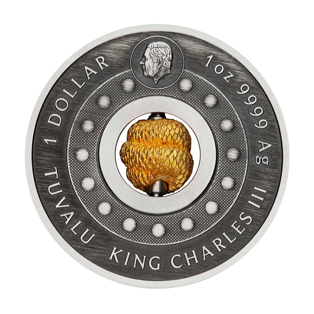 Centralny element monety to miniaturowa, złocona zawieszka z próby 18‑karatowej srebra – można ją obracać, co stanowi unikalne rozwiązanie techniczne i atrakcyjny wizualnie dodatek. Taki gadżet wpisuje się w aktualne trendy kolekcjonerskie, zachęcając różne grupy inwestorów.