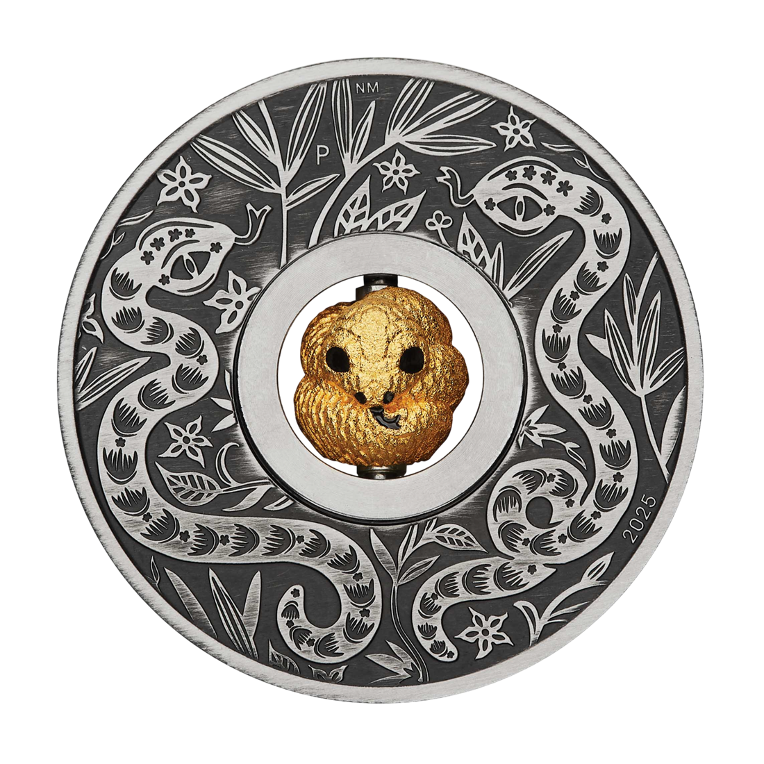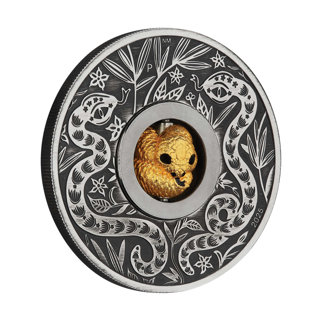 Tło monety nawiązuje do stylu antycznego – celowy proces postarzania nadaje powierzchni autentyczny, zabytkowy wygląd. Obrzeża zdobią dwa wijące się węże wśród stylizowanego listowia, co podkreśla chiński motyw i dodaje głębi kompozycji. Na rewersie widoczny jest znak mennicy „P” (Perth Mint) oraz rok emisji „2025”.
