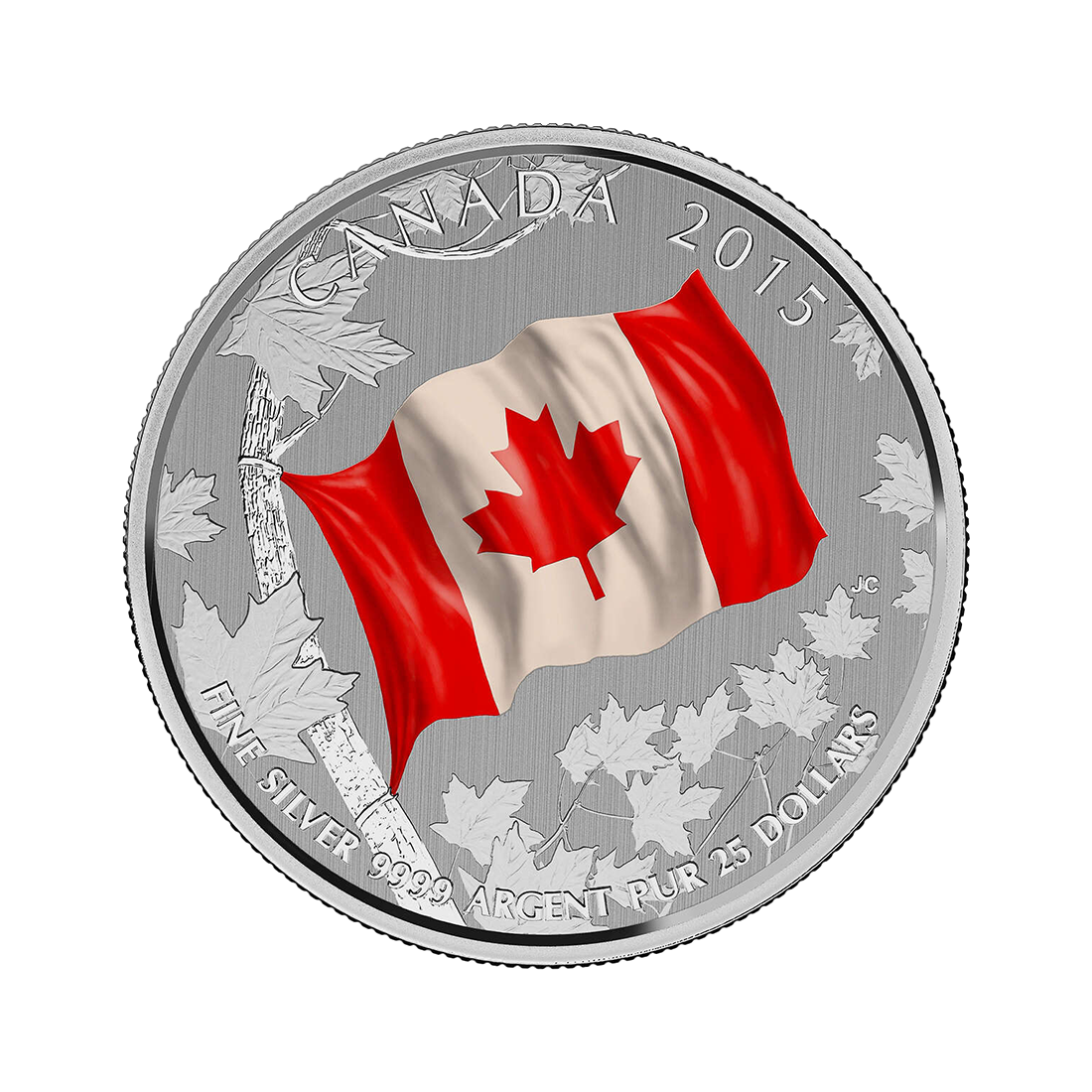 Projekt numizmatu to kompozycja oparta na symbolach narodowych, które zostały przedstawione w wyraźny i uroczysty sposób. Powierzchnia monety jest lustrzana, a elementy graficzne wyróżniają się subtelnym reliefem. Na rewersie dominuje kolorowa flaga Kanady – czerwony liść klonowy na białym tle, flankowany dwoma czerwonymi pasami. Flaga została ukazana w dynamicznym ujęciu, jakby powiewała na wietrze. Powyżej znajduje się napis CANADA 2015, a poniżej widnieje próba srebra, z którego została wykonana moneta oraz nominał. Układ graficzny jest zrównoważony, a intensywne kolory nadają całości patriotyczny charakter. Awers monety przedstawia klasyczny portret królowej Elżbiety II autorstwa Susanny Blunt. Wizerunek monarchini zajmuje centralną część kompozycji, otoczony napisem ELIZABETH II po lewej stronie oraz D. G. REGINA po prawej. Jest on utrzymany w tradycyjnym stylu kanadyjskich emisji, podkreślając oficjalny charakter monety.