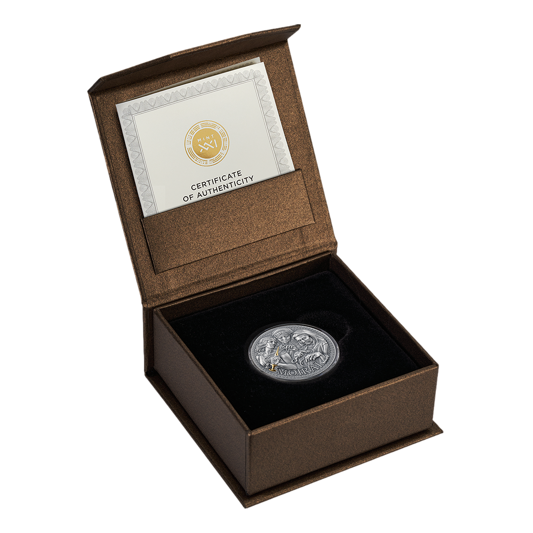 Srebrna moneta „Mitologia Grecka: Mojra 2025” to wyjątkowe połączenie imponującego wzornictwa i inwestycyjnej wartości. Trzy Mojry – Klotha, Lachesis i Atropos – sportretowane z niezwykłym realizmem w stylu antycznym, opowiadają o losie i nieuchronności ludzkiego przeznaczenia. Każda z bogiń wykonana została w wysokim reliefie, z elementami selektywnego pozłocenia, co nadaje projektowi artystycznej głębi i wizualnej siły.